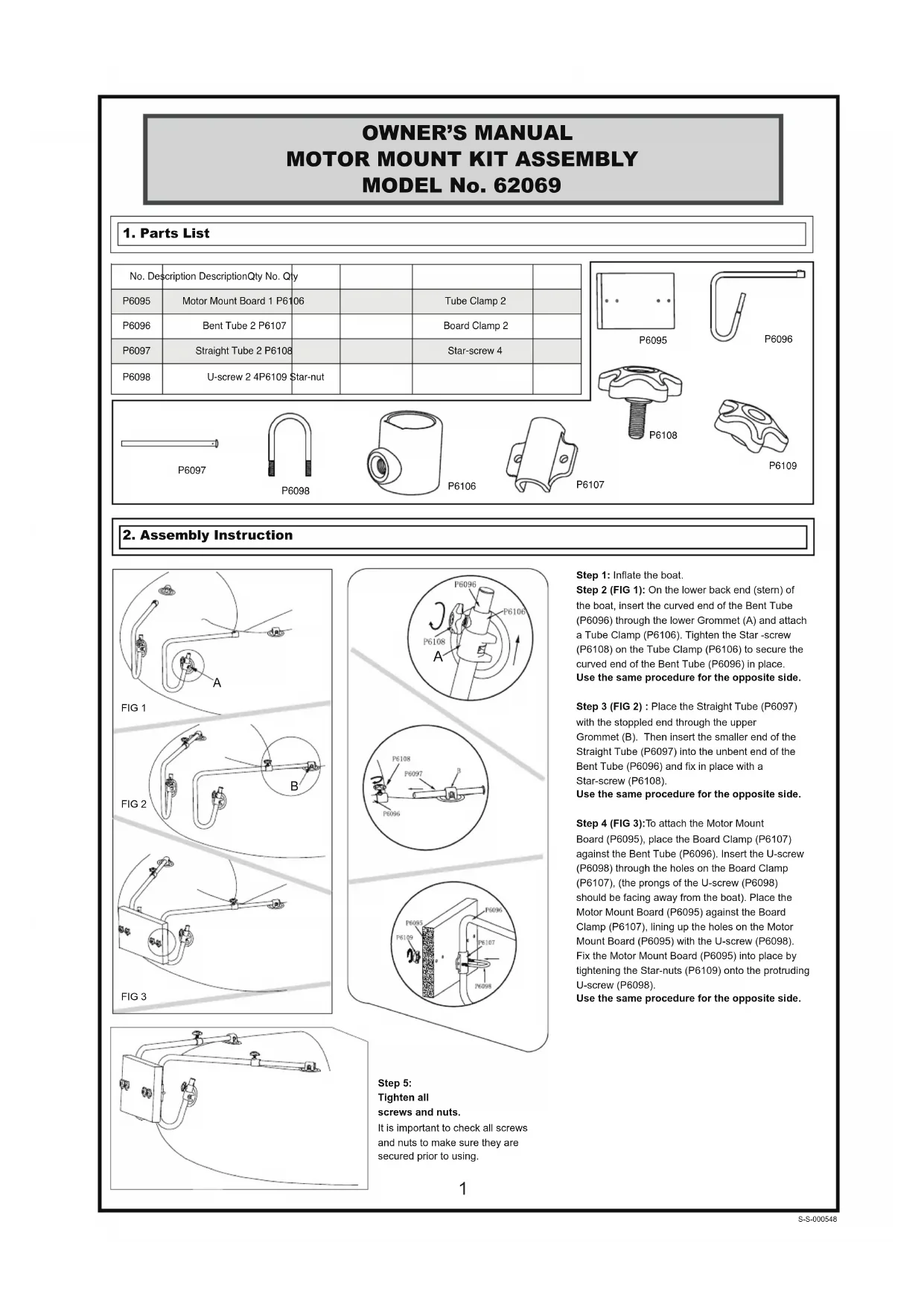 Étape 5: Serrer toutes les vis et rondelles. Il est important de vérifier avant usage toutes les vis et rondelles pour s'assurer qu'elles sont bien bloquées.Étape 1: Gonfler le bateau. Étape 2 (FIG 1): En bas à l'arrière du bateau (la poupe), insérer l'extrémité courbée du tube courbé (P6096) à travers le guide (A) et fixer le collier de tube (P6106). Serrer la vis étoile (P6108) sur le tube courbé (P6106) pour bien mettre cette extrémité du tube courbé (P6096) en place. Répéter la même procédure de l'autre coté.Étape 3 (FIG 2): Positionner le tube droit (P6097) avec l'extrémité bouchée à travers le guide (B). Puis insérer la petite extrémité du tube droit (P6097) dans l'extrémité non courbée du tube courbé (P6096) et mettre en place avec la vis en étoile P6108). Répéter la meme procédure de l'autre coté. Étape 4 (FIG 3): Pour fixer le plateau (P6095), placer le collier du plateau (P6107) sur le tube courbé (P6096). Insérer la vis en U (P6098) dans les trous du collier du plateau (P6107), (les pattes de la vis en U (P6098) doivent faire face contraire au bateau). Positionner le plateau du support moteur (P6095) sur le collier du plateau (P6107), en alignant les trous sur le plateau du support moteur (P6095) avec la vis en U(P6098). Mettre en place et fixer le plateau du support moteur (P6095) en serrant les rondelles en forme d'étoile (P6109) sur la vis en U protubérante (P6098). Répéter la même procédure de l'autre côté.No. Description Description Qté No. QtéP6095 Plateau du support moteur 1 P6106 Collier de tube 2 P6096 Tube courbé 2 P6107 Collier de plateau 2 P6097 Tube droit 2 P6108 Vis en étoile 4 P6098 vis en U 2 4P6109 Rondelle en étoile