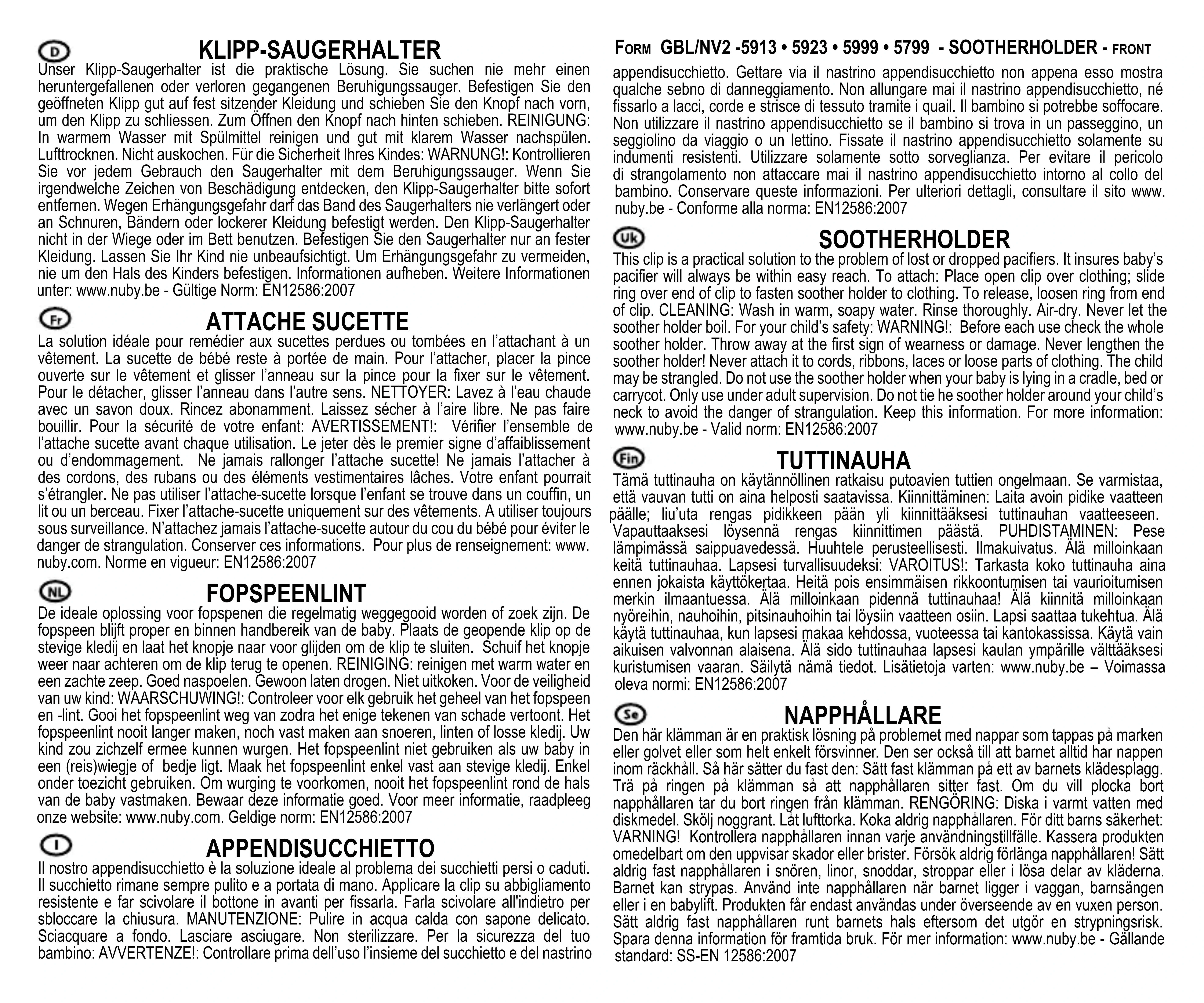 La solution idéale pour remédier aux sucettes perdues ou tombées en l'attachant à un vêtement. La sucette de bébé reste à portée de main. Pour l'attacher, placer la pince ouverte sur le vêtement et glisser l'anneau sur la pince pour la fixer sur le vêtement. Pour le détacher, glisser l'anneau dans l'autre sens. NETTOYER: Lavez à l'eau chaude avec un savon doux. Rincez abonamment. Laissez sécher à l'aire libre. Ne pas faire bouillir. Pour la sécurité de votre enfant: AVERTISSEMENT!: Vérifier l'ensemble de l'attache sucette avant chaque utilisation. Le jeter dès le premier signe d'affaiblissement ou d'endommagement. Ne jamais rallonger l'attache sucette! Ne jamais l'attacher à des cordons, des rubans ou des éléments vestimentaires lâches. Votre enfant pourrait s'étrangler. Ne pas utiliser l'attache-sucette lorsque l'enfant se trouve dans un couffin, un lit ou un berceau. Fixer l'attache-sucette uniquement sur des vêtements. A utiliser toujours sous surveillance. N'attachez jamais l'attache-sucette autour du cou du bébé pour éviter le danger de strangulation. Conserver ces informations. Pour plus de renseignement: www.nuby.com. Norme en vigueur: EN12586:2007