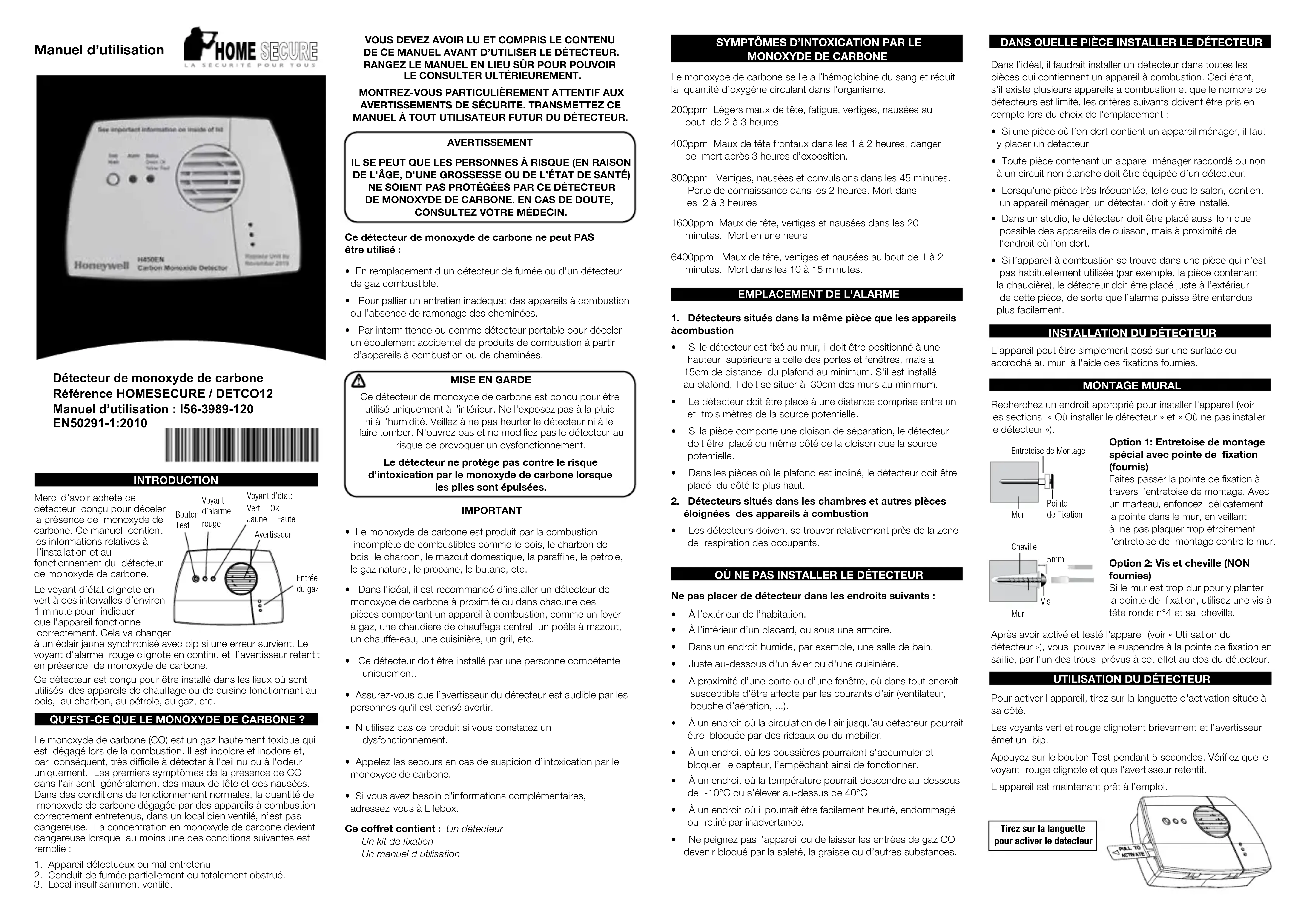 Merci d'avoir acheté ce détecteur conçu pour déceler la présence de monoxyde de carbone. Ce manuel contient les informations relatives à l'installation et au