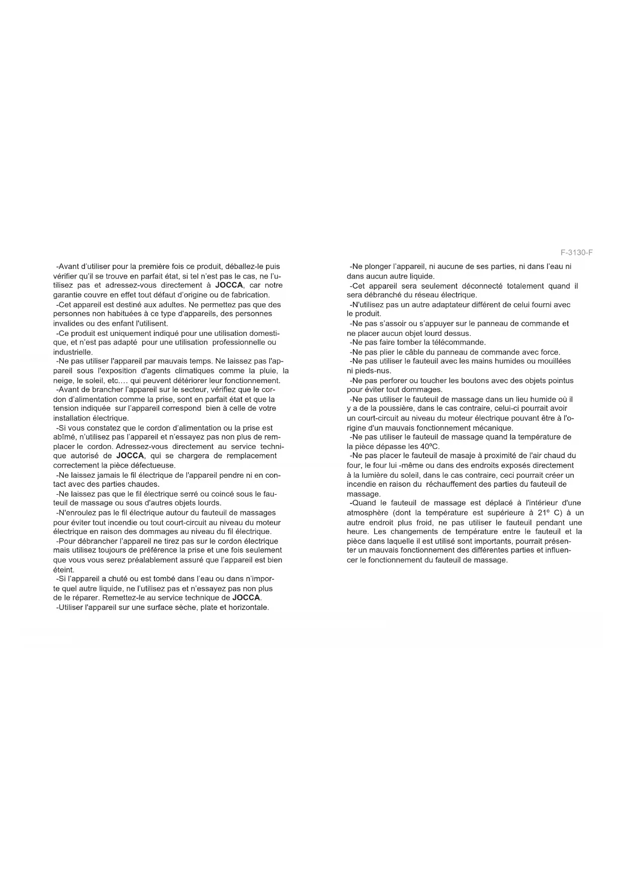 -Si vous constaze que le cordon d'alimentation ou la prise est abimé, n'utilise pas l'appareil et n'essayez pas non plus de replacer le cordon. Adressez-vous directement au service technique autorisé de JOCCA, qui se chargerà de remplacement correctement la piece défectueuse.
