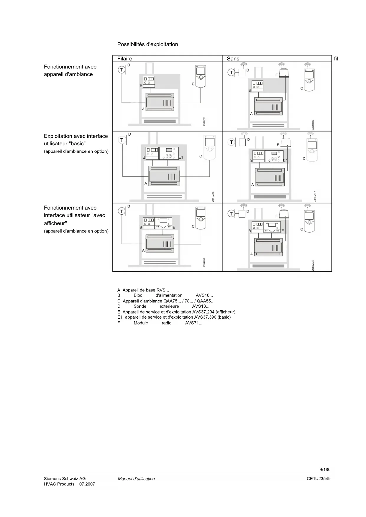 A Appareil de base RVS... B Bloc d'alimentation AVS16... C Appareil d'ambiance QAA75... / 78... / QAA55.. D Sonde extérieure AVS13... E Appareil de service et d'exploitation AVS37.294 (afficheur) E1 appareil de service et d'exploitation AVS37.390 (basic) F Module radio AVS71... Fonctionnement avec appareil d'ambiance Exploitation avec interface utilisateur "basic" (appareil d'ambiance en option) Fonctionnement avec interface utilisateur "avec afficheur" (appareil d'ambiance en option)10/180 Siemens Schweiz AG Manuel d’utilisation CE1U2354fr HVAC Products 07.2007 2 Indications relatives à la sécurité