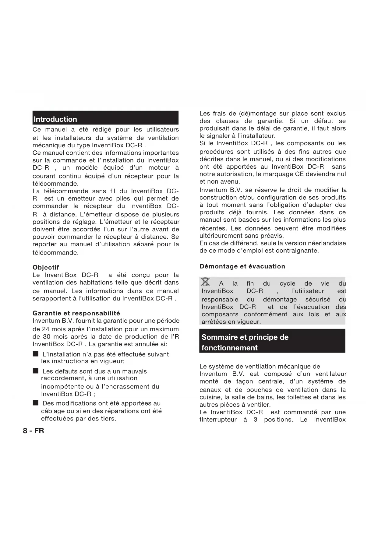 Inventum B.V. fournit la garantie pour une période de 24 mois après l'installation pour un maximum de 30 mois après la date de production de l'R InventiBox DC-R. La garantie est annulée si: