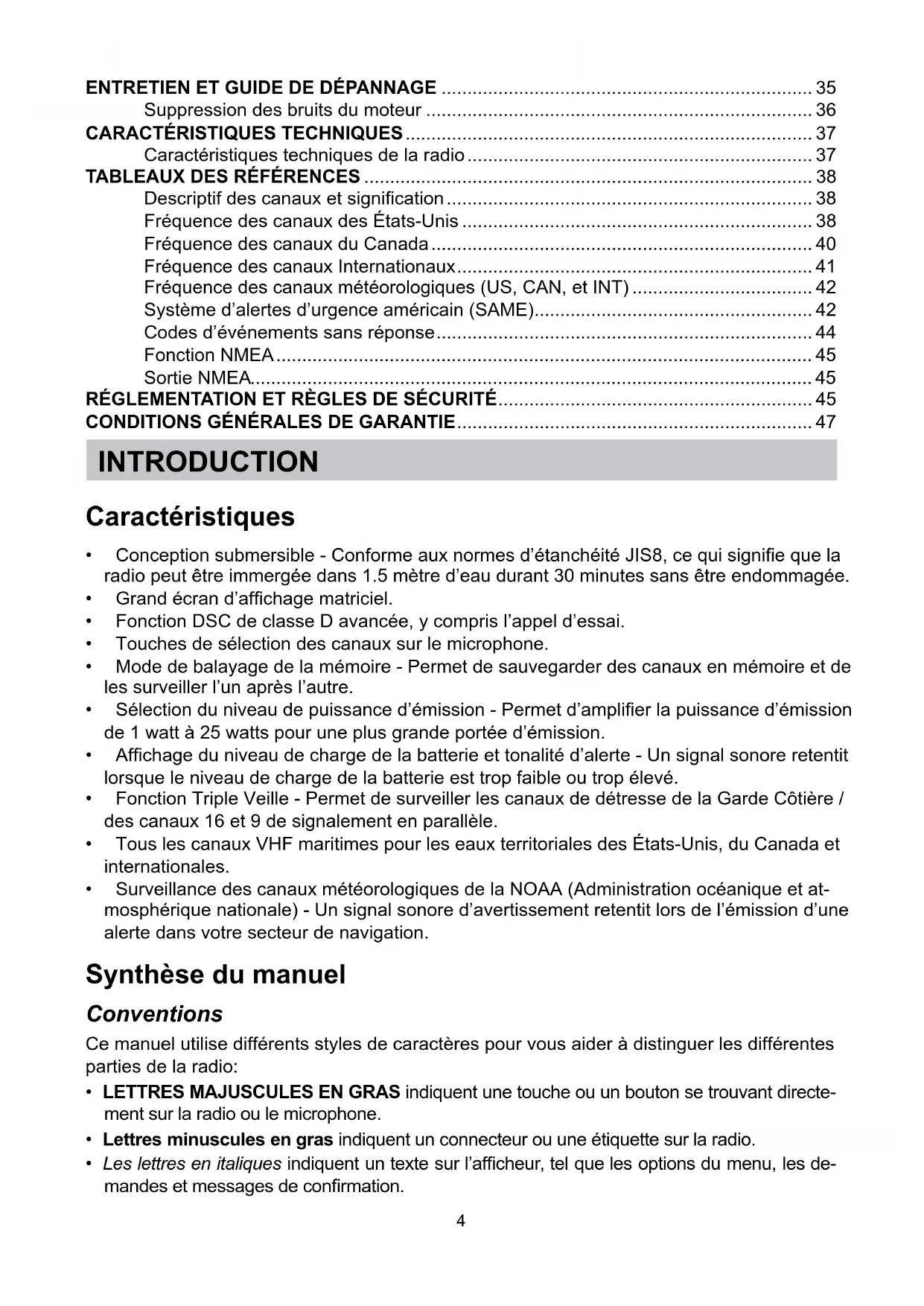 - SurveillancedescanauxmétéorologiquesdelaNOAA(Administrationocéaniqueetat- mosphériquenationale)-Unsignalsonored’avertissementretentitlorsdel’émissiond’une alerte dans votre secteur de navigation. Synthèse du manuel Conventions Cemanuelutilisedifférentsstylesdecaractèrespourvousaideràdistinguerlesdifférentes parties de la radio: