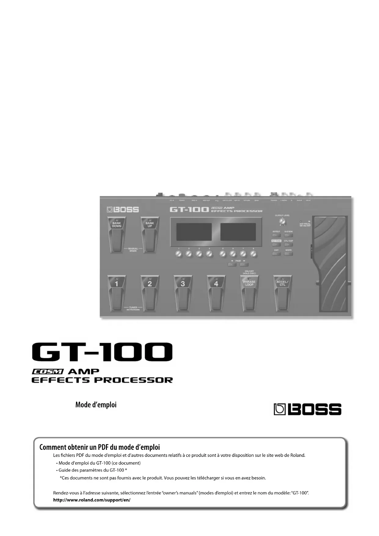 - Guide des paramètres du GT-100 * *Ces documents ne sont pas fournis avec le produit. Vous pouvez les télécharger si vous en avez besoin. Rendez-vous à l’adresse suivante, sélectionnez l’entrée “owner’s manuals” (modes d’emploi) et entrez le nom du modèle: “GT-100”. Comment obtenir un PDF du mode d’emploi Les chiers PDF du mode d’emploi et d’autres documents relatifs à ce produit sont à votre disposition sur le site web de Roland.