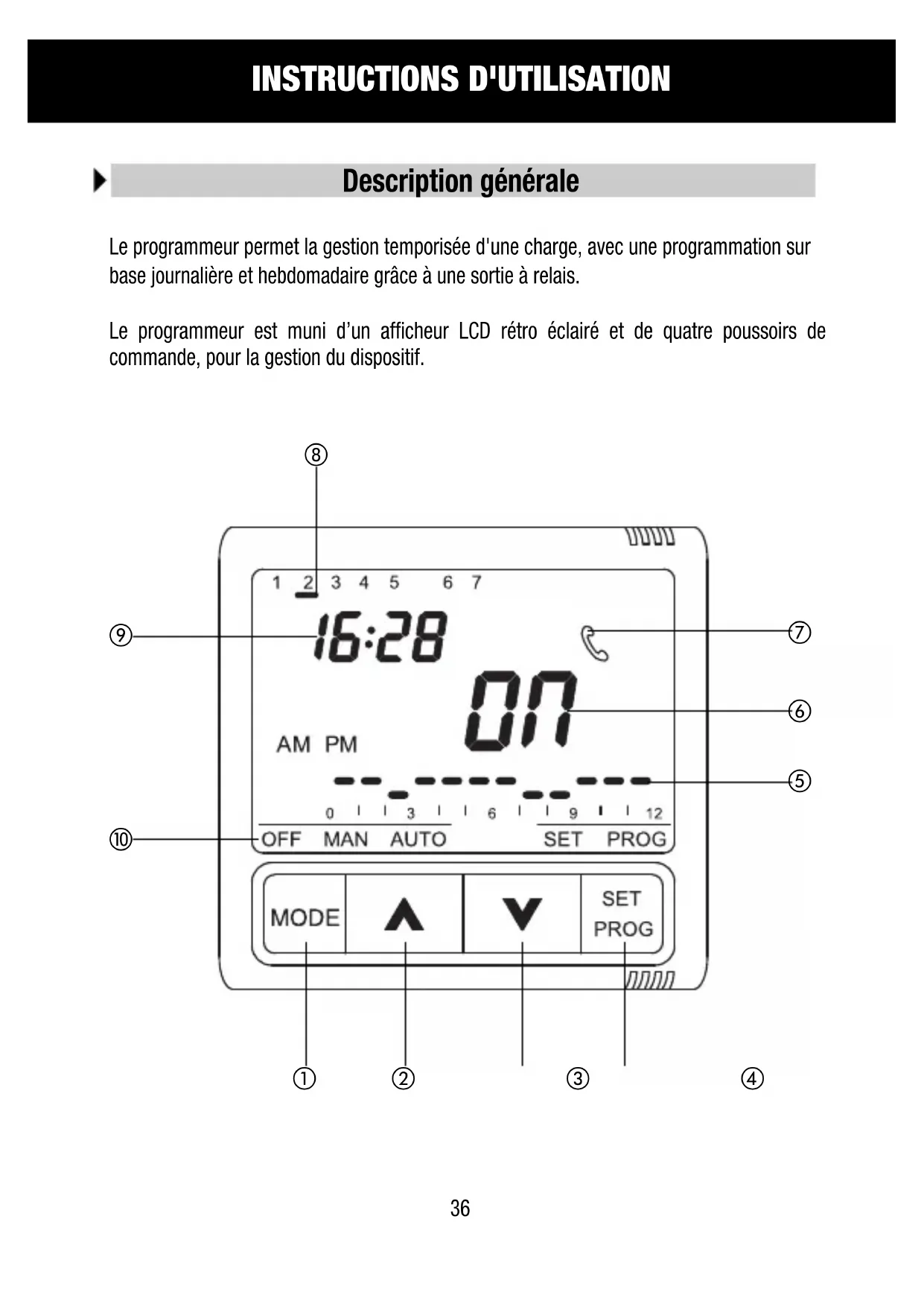 1 2 3 4 5 6 7 16:28 ON MANPour activer le mode de fonctionnement manuel, appuyer sur la touche MODE jusqu'à ce que l'afficheur visualise le message MAN.
