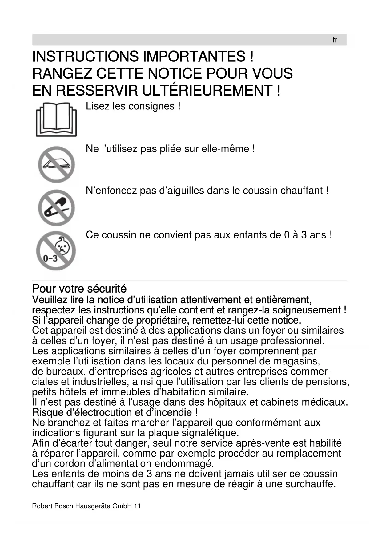 EN RESSERVIR ULTÉRIEUREMENT ! Lisez les consignes ! Ne l’utilisez pas pliée sur elle-même ! N’enfoncez pas d’aiguilles dans le coussin chauffant ! Ce coussin ne convient pas aux enfants de 0 à 3 ans ! Pour votre sécurité Veuillez lire la notice d’utilisation attentivement et entièrement, respectez les instructions qu’elle contient et rangez-la soigneusement ! Si l’appareil change de propriétaire, remettez-lui cette notice. Cet appareil est destiné à des applications dans un foyer ou similaires à celles d’un foyer, il n’est pas destiné à un usage professionnel. Les applications similaires à celles d’un foyer comprennent par exemple l’utilisation dans les locaux du personnel de magasins, de bureaux, d’entreprises agricoles et autres entreprises commer- ciales et industrielles, ainsi que l’utilisation par les clients de pensions, petits hôtels et immeubles d’habitation similaire. Il n’est pas destiné à l’usage dans des hôpitaux et cabinets médicaux. Risque d’électrocution et d’incendie ! Ne branchez et faites marcher l’appareil que conformément aux indications figurant sur la plaque signalétique. Afin d’écarter tout danger, seul notre service après-vente est habilité à réparer l’appareil, comme par exemple procéder au remplacement d’un cordon d’alimentation endommagé. Les enfants de moins de 3 ans ne doivent jamais utiliser ce coussin chauffant car ils ne sont pas en mesure de réagir à une surchauffe. fr12 Robert Bosch Hausgeräte GmbH Les enfants de moins de 8 ans ne doivent jamais utiliser l’appareil, sauf si un parent ou un tuteur a réglé le thermostat sur le niveau de température le plus bas. Les enfants de 8 ans et plus, les personnes souffrant d’un handicap physique, sensoriel ou mental ou ne détenant pas l’expérience et / ou les connaissances nécessaires pourront utiliser cet appareil à condition de le faire sous surveillance, ou que son utilisation sûre leur ait été enseignée et qu’ils aient compris les dangers qui en émanent. Ne permettez jamais aux enfants de jouer avec l’appareil. Il ne faut pas que les enfants s’occupent du nettoyage et de la mainte- nance par l’utilisateur, sauf s’ils sont âgés de 8 ans et plus et agissent sous surveillance. Risque de surchauffe ! Si l’appareil reste allumé pendant une période prolongée, il faudrait régler le thermostat sur la position de fonctionnement permanent. Risque de blessures ! Le coussin chauffant ne doit jamais être utilisé par les personnes dépourvues de sensibilité à la chaleur, et par d’autres personnes nécessitant protection et incapables de réagir à une surchauffe. Pictogramme Ne pas laver ! Laver à 40 °C ! Ne pas sécher au sèche-linge ! Sécher en tambour ! Ne pas repasser ! Repasser à basse température ! Blanchiment prohibé ! Dégraissage chimique prohibé ! Autres consignes de sécurité Vérifiez régulièrement si l’appareil présente des signes d’usure ou d’endommagement. En présence de tels signes ou si l’appareil a été utilisé de façon inexperte ou encore s'il ne fonctionne pas, il faudra le rapporter au revendeur avant de vous en servir de nouveau. N’utilisez l’appareil que si son cordon d’alimen- tation et l’appareil lui-même ne présentent aucun dommage. Débranchez immédiatement la fiche mâle de la prise de courant après chaque utilisation et en cas de défectuosité. N’enroulez pas le cordon d’alimentation autour du thermostat. Ne recouvrez pas le thermostat ! Pour garantir que le thermostat fonctionne correctement, ne le posez jamais sur ou sous un coussin, ne le recouvrez jamais avec un autre objet. frRobert Bosch Hausgeräte GmbH 13 L’appareil émet des champs électriques et magnétiques très faibles éventuellement susceptibles de gêner le fonctionnement d’un stimulateur cardiaque. Pour cette raison, nous conseillons de consulter le médecin traitant ou le fabricant du stimulateur cardiaque avant d’utiliser l’appareil. Le thermostat et le cordon d’alimentation de l’appareil doivent être posés de telle manière qu’il n’y ait aucun risque de stran- gulation, de trébucher ou de risque similaire. Une utilisation permanente du coussin réglé sur une chaleur élevée peut provoquer des brûlures cutanées. Assurez-vous impérativement que l’utilisateur ne s’endorme pas pendant l’utilisation du coussin chauffant ! N’utilisez le coussin chauffant que dans des locaux secs (jamais dans une salle de bain ou assimilée). Ne faites jamais marcher le coussin chauffant sans surveillance ! Éteignez-le toujours avant de quitter la pièce. Ne froissez pas le coussin ! Après avoir replié et rangé l'appareil, ne déposez dessus aucun objet qui serait susceptible d'aplatir fortement les pliures. N’utilisez jamais le coussin chauffant à l’état humide ou mouillé ; faites-le d’abord sécher complètement N’utilisez pas ce coussin chauffant avec des animaux Risque d’asphyxie ! Ne permettez jamais aux enfants de jouer avec les matériaux d’emballage. Pièces et éléments de commande Figure1 1 Coussin chauffant 2 Housse en tissu 3 Thermostat 4 Voyant de contrôle Possibilités d’application Ce coussin chauffant est destiné à servir sur les parties corporelles suivantes : bras, dos, ventre, épaules, cuisses, mollets, etc. Mise en service Insérez le coussin chauffant (N) dans la housse en tissu (O). Assurez-vous que le cordon d’alimentation et le thermostat (P) se trouvent hors de la housse (O ). Fermez la fermeture auto-agrippante ou à glissières. Réglez la température voulue par le thermostat (P). Important : Si l’appareil doit marcher en permanence, le réglage du thermostat sur la première position est recommandé. Figure 2 Le fait de régler la température par le thermo- stat (P) met le coussin chauffant sous tension et le voyant de fonctionnement (Q) s’allume. Figure 3 Lorsque le thermostat (P) se trouve sur la po