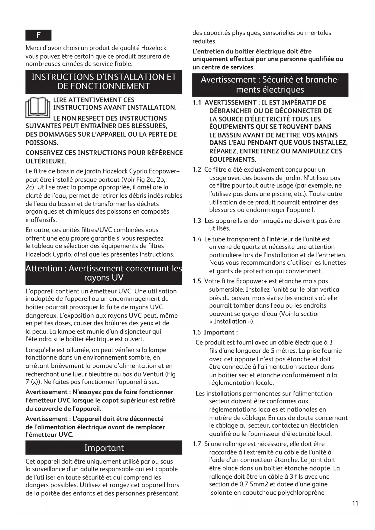 En outre, ces unités filtres/UVC combinées vous offrent une eau propre garantie si vous respectez le tableau de sélection des équipements de filtres Hozelock Cyprio, ainsi que les présentes instructions.