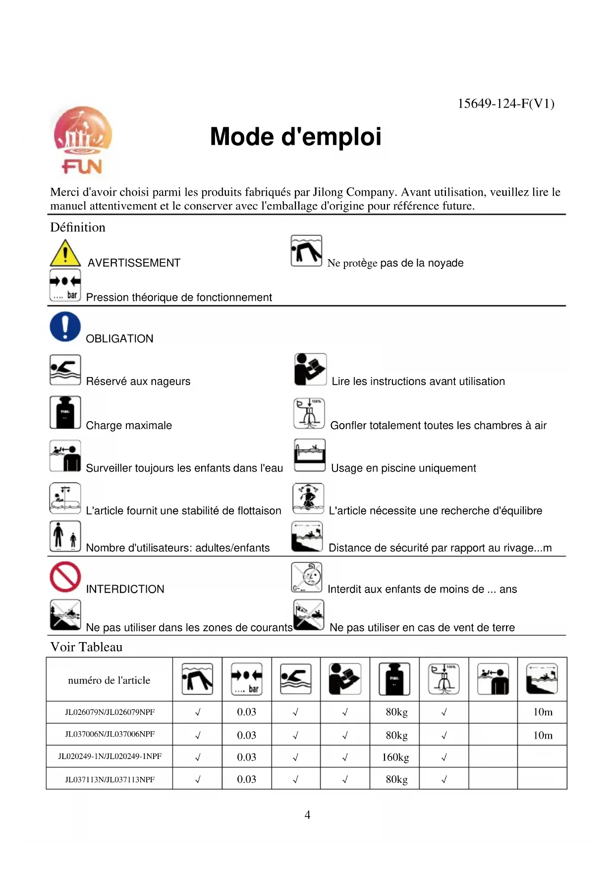 for the children. Repair Patch Instructions (Small pinhole and small puncture leaks can be repaired with the included repair patch) a) Locate the leak place. b) Deflate the air. c) Clean the area surrounding the leakage and wipe up all water from the surface. d) Take out the repair patch, cut it into required shape and size, which should be litter larger than the leaking area, put the patch on leaking area and press firmly. e) You can use it again after 24 hours drying of the repaired position. If the damage is bigger than 1” (2.5cm), we recommend using a Silicone or rubber based glue for repair. Please read warning statement on glue prior to use. Shanghai Jilong Plastic Products Co. Ltd. No. 460 Lanxue Road, Huanglou, Pudong Area, Shanghai, 201205, P.R. China Tel: +86-21-58942200 E-mail: info@jilong.com Web: www.jilong.com4 Merci d'avoir choisi parmi les produits fabriqués par Jilong Company. Avant utilisation, veuillez lire le manuel attentivement et le conserver avec l'emballage d'origine pour référence future. Définition AVERTISSEMENT Ne protège pas de la noyade Pression théorique de fonctionnement OBLIGATION Réservé aux nageurs Lire les instructions avant utilisation Charge maximale Gonfler totalement toutes les chambres à air Surveiller toujours les enfants dans l'eau Usage en piscine uniquement L'article fournit une stabilité de flottaison L'article nécessite une recherche d'équilibre Nombre d'utilisateurs: adultes/enfants Distance de sécurité par rapport au rivage...m INTERDICTION Interdit aux enfants de moins de ... ans Ne pas utiliser dans les zones de courants Ne pas utiliser en cas de vent de terre Voir Tableau numéro de l'article