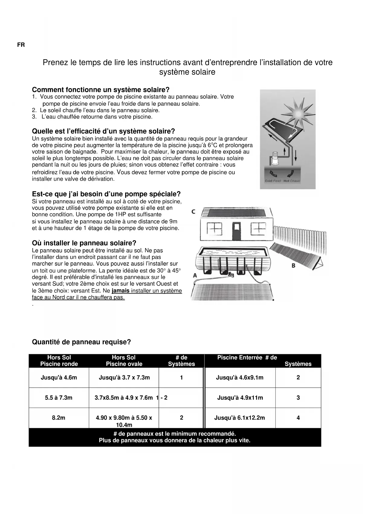 C et prolongera votre saison de baignade. Pour maximiser la chaleur, le panneau doit être exposé au soleil le plus longtemps possible. L’eau ne doit pas circuler dans le panneau solaire pendant la nuit ou les jours de pluies; sinon vous obtenez l’effet contraire : vous refroidirez l’eau de votre piscine. Vous devez fermer votre pompe de piscine ou installer une valve de dérivation. Est-ce que j’ai besoin d’une pompe spéciale? Si votre panneau est installé au sol à coté de votre piscine, vous pouvez utilisé votre pompe existante si elle est en bonne condition. Une pompe de 1HP est suffisante si vous installez le panneau solaire à une distance de 9m et à une hauteur de 1 étage de la pompe de votre piscine. Où installer le panneau solaire? Le panneau solaire peut être installé au sol. Ne pas l’installer dans un endroit passant car il ne faut pas marcher sur le panneau. Vous pouvez aussi l’installer sur un toit ou une plateforme. La pente idéale est de 30 à 45 degré. Il est préférable d'installé les panneaux sur le versant Sud; votre 2ème choix est sur le versant Ouest et le 3ème choix: versant Est. Ne jamais installer un système face au Nord car il ne chauffera pas.