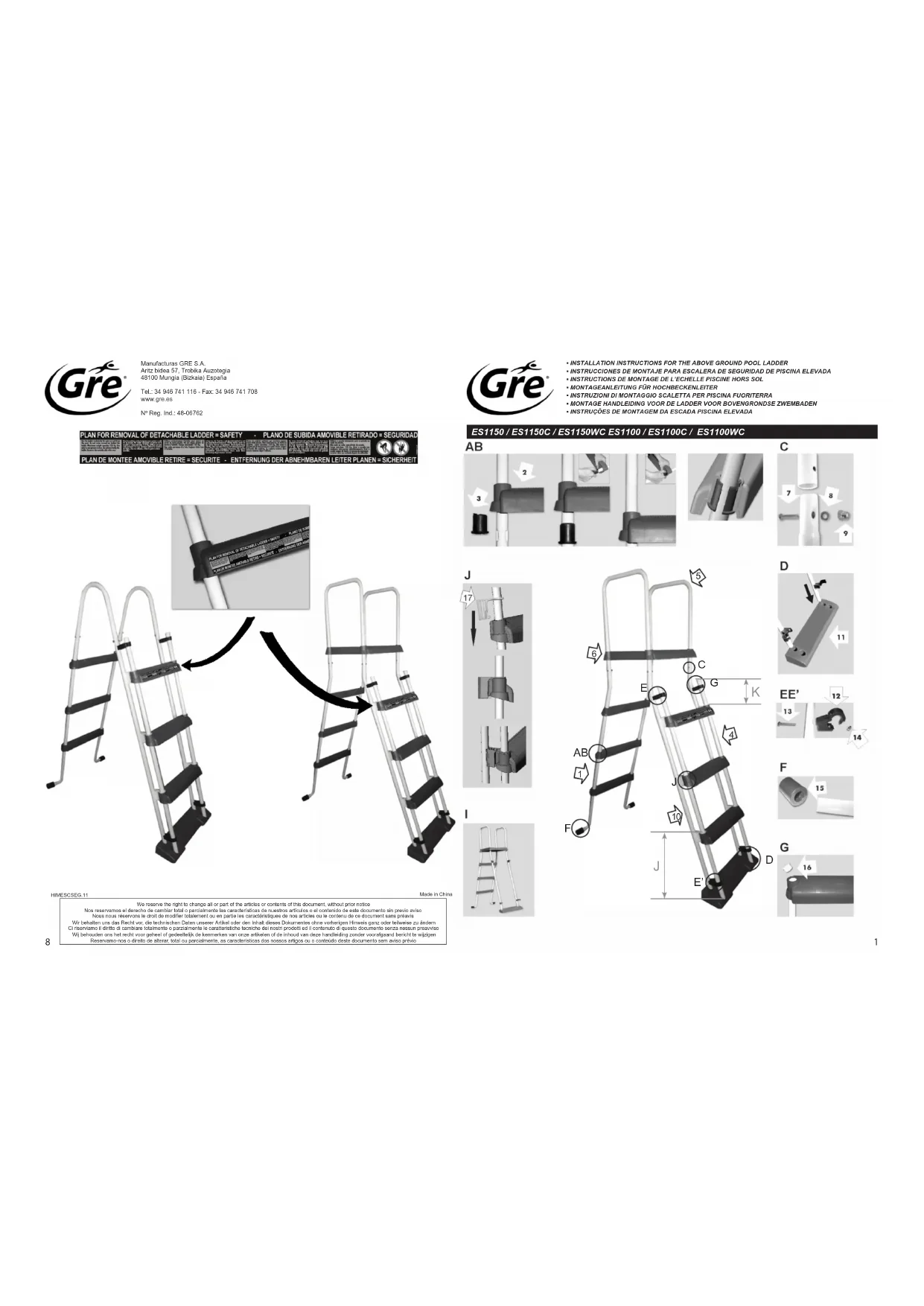 JCet escalier étant facile à monter, il peut être monté par une seule personne adulte et dans une période de temps d’environ 1 HEURE. Seuls les outils suivants sont nécessaires: Tournevis plat – Clé xe de 10 mm. A- Placer deux douilles (3) dans les rainures inférieures des deux mains courantes (1). Introduire un degré (2) sur la partie supérieure des deux mains courantes et le faire glisser jusqu’aux douilles montées au préalable , en appuyant le degré d’abord contre l’une des douilles, puis contre l’autre, en veillant à le déplacer autant d’un côté que de l’autre jusqu’à ce qu’il arrive bien au fond. Répéter successivement le procédé pour les autres degrés des mains courantes à rainure (1) et, en utilisant le même procédé, introduire la plate-forme (6) dans les ponts d’assemblage (5) sur les modèles ES1150, ES1152 et ES11502W. B- Pour la parti mobile (4), répéter successivement les instructions décrites en A. Introduire postérieurement dans la marche la pièce séparatrice dans chaque main courante jusqu’à ce qu’elle reste ssée dans la marche. Le main courante doit être placer avec la partie “J” vers le bas. “J” plus grand que “K” C- Après avoir monté tous les degrés, assembler les mains courantes à rainure (1) et les mains courantes sans rainure (10) au moyen des ponts d’assemblage (5), et les xer à l’aide des vis (7), rondelles (8) et écrous (9). D- Introduire la partie inférieure des mains courantes sans rainures (10) dans les logements de la base (11) jusqu’à ce qu’elle arrive bien au fond. E- Monter les 4 pinces de sécurité (12) sur la partie frontale des mains courantes sans rainure (10), avec leurs vis (13) et leurs écrous (14) respectifs. F- Placer les bouchons d’amortissement (15) à l’extrémité de la partie recourbée des mains courantes (1) et mettre cette partie à l’intérieur de la piscine. G- Placer les 2 bouchons blancs (16) aux extrémités supérieures des mains courantes mobiles (4). H- Pour utiliser l’escalier, introduire la partie mobile dans la base (11) et la xer, en utilisant les pinces. I- Lorsque l’escalier n’est pas utilisé, et pour le mettre en position de sécurité, ouvrir les pinces et enlever la partie mobile de la base. Par mesure de sécurité, ranger la partie mobile hors de la portée des enfants. Very important: