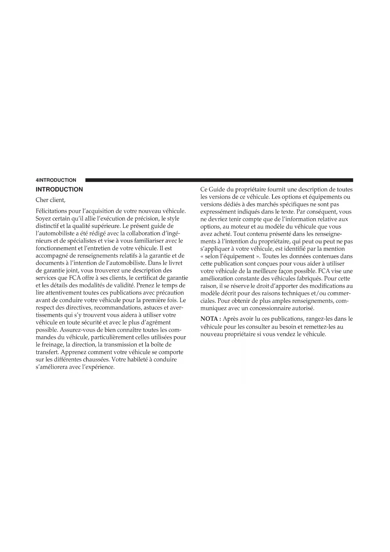 1INTRODUCTION Cher client, Félicitations pour l’acquisition de votre nouveau véhicule. Soyez certain qu’il allie l’exécution de précision, le style distinctif et la qualité supérieure. Le présent guide de l’automobiliste a été rédigé avec la collaboration d’ingé- nieurs et de spécialistes et vise à vous familiariser avec le fonctionnement et l’entretien de votre véhicule. Il est accompagné de renseignements relatifs à la garantie et de documents à l’intention de l’automobiliste. Dans le livret de garantie joint, vous trouverez une description des services que FCA offre à ses clients, le certificat de garantie et les détails des modalités de validité. Prenez le temps de lire attentivement toutes ces publications avec précaution avant de conduire votre véhicule pour la première fois. Le respect des directives, recommandations, astuces et aver- tissements qui s’y trouvent vous aidera à utiliser votre véhicule en toute sécurité et avec le plus d’agrément possible. Assurez-vous de bien connaître toutes les com- mandes du véhicule, particulièrement celles utilisées pour le freinage, la direction, la transmission et la boîte de transfert. Apprenez comment votre véhicule se comporte sur les différentes chaussées. Votre habileté à conduire s’améliorera avec l’expérience. Ce Guide du propriétaire fournit une description de toutes les versions de ce véhicule. Les options et équipements ou versions dédiés à des marchés spécifiques ne sont pas expressément indiqués dans le texte. Par conséquent, vous ne devriez tenir compte que de l’information relative aux options, au moteur et au modèle du véhicule que vous avez acheté. Tout contenu présenté dans les renseigne- ments à l’intention du propriétaire, qui peut ou peut ne pas s’appliquer à votre véhicule, est identifié par la mention « selon l’équipement ». Toutes les données contenues dans cette publication sont conçues pour vous aider à utiliser votre véhicule de la meilleure façon possible. FCA vise une amélioration constante des véhicules fabriqués. Pour cette raison, il se réserve le droit d’apporter des modifications au modèle décrit pour des raisons techniques et/ou commer- ciales. Pour obtenir de plus amples renseignements, com- muniquez avec un concessionnaire autorisé. NOTA : Après avoir lu ces publications, rangez-les dans le véhicule pour les consulter au besoin et remettez-les au nouveau propriétaire si vous vendez le véhicule. 4 INTRODUCTIONEn ce qui concerne le service après-vente, nous tenons à vous rappeler que c’est votre concessionnaire autorisé qui connaît le mieux votre véhicule, car il dispose de techni- ciens formés en usine, offre des pièces MOPAR