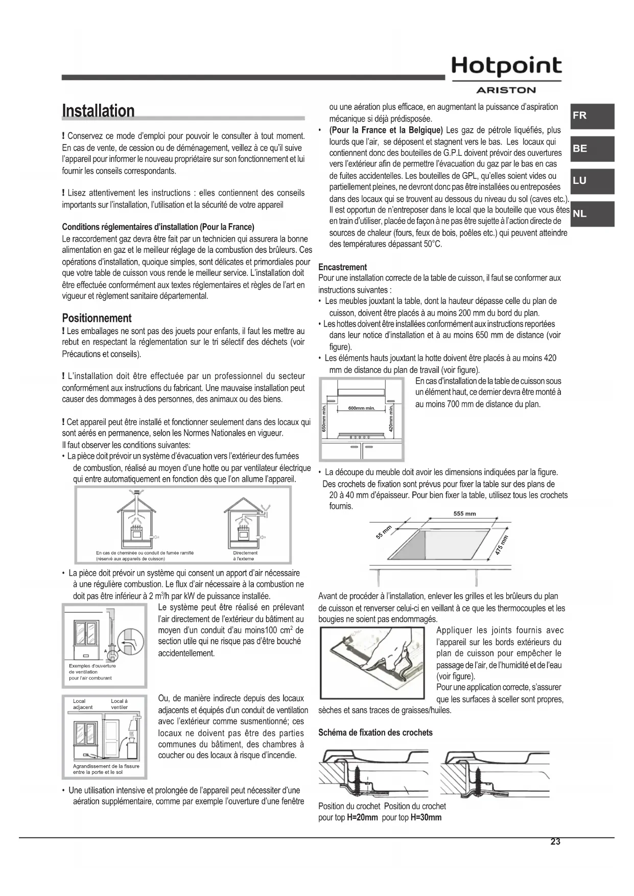 Installation ! Conservez ce mode d’emploi pour pouvoir le consulter à tout moment. En cas de vente, de cession ou de déménagement, veillez à ce qu’il suive l’appareil pour informer le nouveau propriétaire sur son fonctionnement et lui fournir les conseils correspondants. ! Lisez attentivement les instructions : elles contiennent des conseils importants sur l’installation, l’utilisation et la sécurité de votre appareil Conditions réglementaires d’installation (Pour la France) Le raccordement gaz devra être fait par un technicien qui assurera la bonne alimentation en gaz et le meilleur réglage de la combustion des brûleurs. Ces opérations d’installation, quoique simples, sont délicates et primordiales pour que votre table de cuisson vous rende le meilleur service. L’installation doit être effectuée conformément aux textes réglementaires et règles de l’art en vigueur et règlement sanitaire départemental. Positionnement ! Les emballages ne sont pas des jouets pour enfants, il faut les mettre au rebut en respectant la réglementation sur le tri sélectif des déchets (voir Précautions et conseils). ! L’installation doit être effectuée par un professionnel du secteur conformément aux instructions du fabricant. Une mauvaise installation peut causer des dommages à des personnes, des animaux ou des biens. ! Cet appareil peut être installé et fonctionner seulement dans des locaux qui sont aérés en permanence, selon les Normes Nationales en vigueur. Il faut observer les conditions suivantes:
