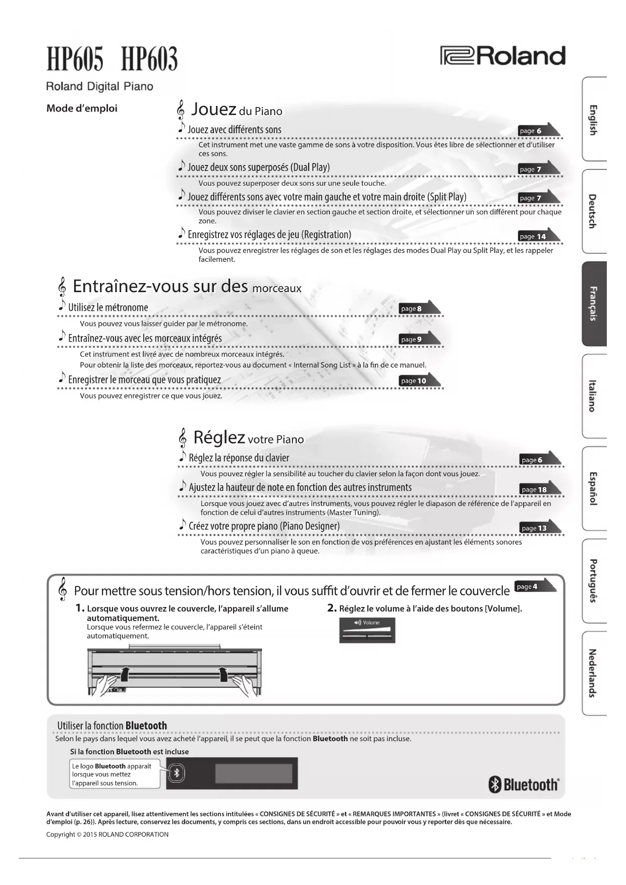 Mode d’emploi Avant d’utiliser cet appareil, lisez attentivement les sections intitulées « CONSIGNES DE SÉCURITÉ » et « REMARQUES IMPORTANTES » (livret « CONSIGNES DE SÉCURITÉ » et Mode d’emploi (p. 26)). Après lecture, conservez les documents, y compris ces sections, dans un endroit accessible pour pouvoir vous y reporter dès que nécessaire. Copyright © 2015 ROLAND CORPORATION ° Jouez du Piano