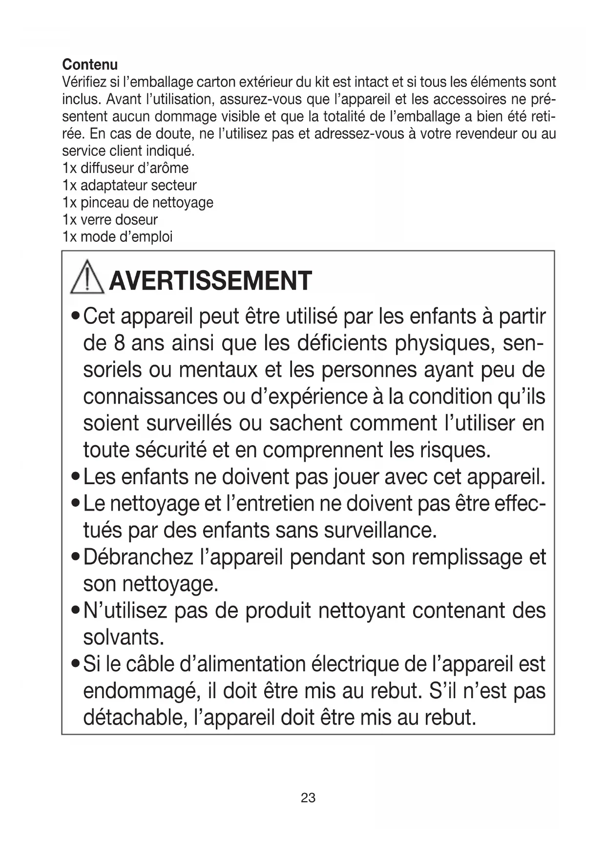 Si le câble d’alimentation électrique de l’appareil est endommagé, il doit être mis au rebut. S’il n’est pas détachable, l’appareil doit être mis au rebut.24 1 Symboles utilisés Les pictogrammes suivants sont employés dans ce mode d’emploi et sur l’appa- reil: AVERTISSEMENT Ce symbole vous avertit des risques de blessures ou des dangers pour votre santé. ATTENTION Ce symbole vous avertit des éventuels dommages au niveau de l’appareil ou d’un accessoire. Remarque Ce symbole indique des informations importantes. Respectez les consignes du mode d’emploi. Élimination conformément à la directive européenne WEEE (Waste Electrical and Electronic Equipment) relative aux déchets d’équipements électriques et électroniques Ce produit répond aux exigences des directives européennes et nationales en vigueur. Fabricant 2 Utilisation conforme aux recommandations Le diuseur d’arôme est destiné exclusivement à améliorer l’odeur ambiante. L’appareil est conçu pour un usage domestique. N’utilisez l’appareil qu’aux fins pour lesquelles il a été conçu et conformément aux indications données par ce mode d’emploi. Toute utilisation inappropriée peut être dangereuse! Le fabricant ne peut être tenu pour responsable des dommages causés par une utilisation inappropriée ou non conforme.25 3 Remarques Le non-respect des instructions suivantes est susceptible d’entraîner des dom- mages corporels ou matériels. Consignes de sécurité AVERTISSEMENT