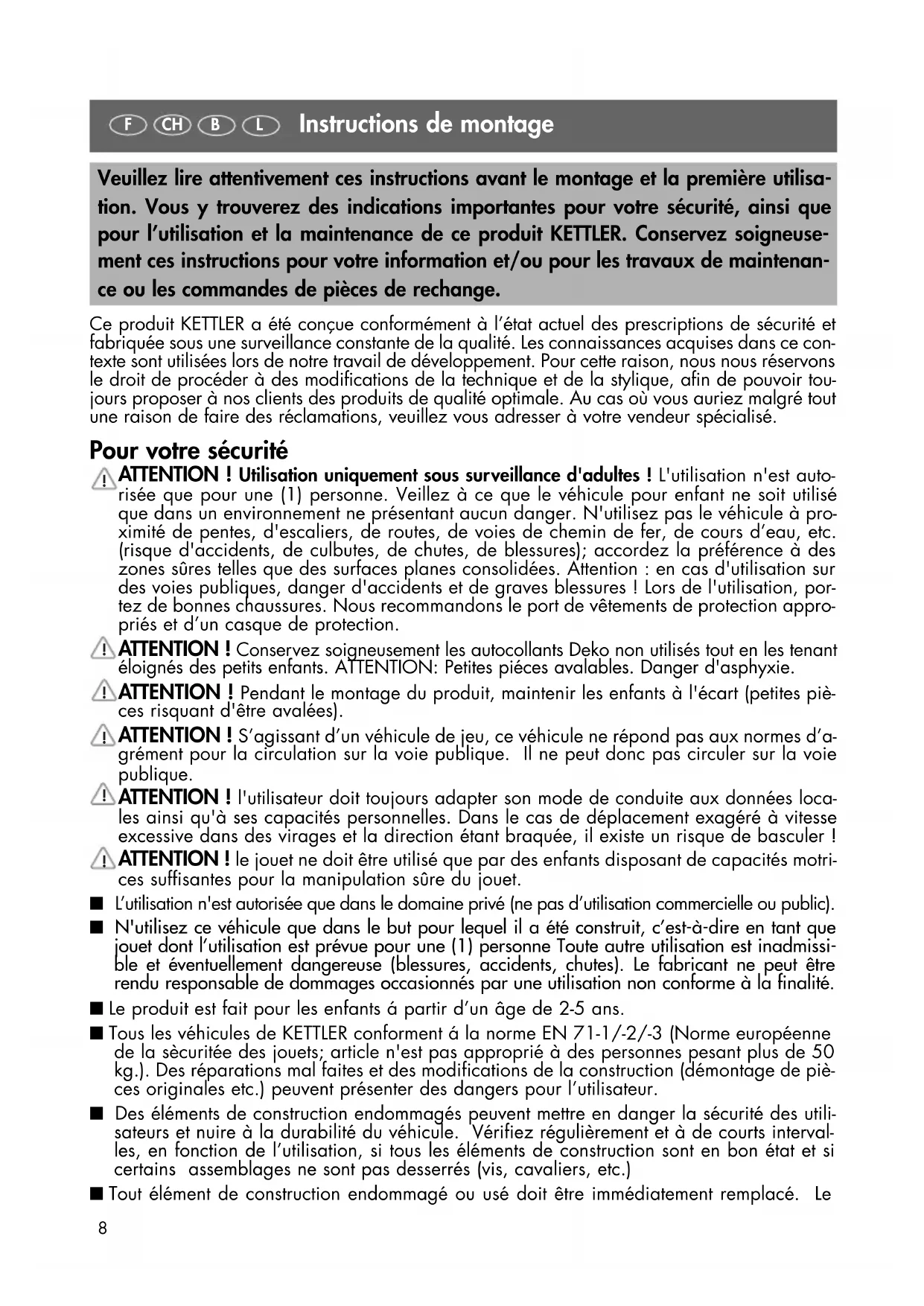 GB IRL8 Instructions de montage Veuillez lire attentivement ces instructions avant le montage et la première utilisa- tion. Vous y trouverez des indications importantes pour votre sécurité, ainsi que pour l’utilisation et la maintenance de ce produit KETTLER. Conservez soigneuse- ment ces instructions pour votre information et/ou pour les travaux de maintenan- ce ou les commandes de pièces de rechange. Ce produit KETTLER a été conçue conformément à l’état actuel des prescriptions de sécurité et fabriquée sous une surveillance constante de la qualité. Les connaissances acquises dans ce con- texte sont utilisées lors de notre travail de développement. Pour cette raison, nous nous réservons le droit de procéder à des modifications de la technique et de la stylique, afin de pouvoir tou- jours proposer à nos clients des produits de qualité optimale. Au cas où vous auriez malgré tout une raison de faire des réclamations, veuillez vous adresser à votre vendeur spécialisé. Pour votre sécurité ATTENTION ! Utilisation uniquement sous surveillance d'adultes ! L'utilisation n'est auto- risée que pour une (1) personne. Veillez à ce que le véhicule pour enfant ne soit utilisé que dans un environnement ne présentant aucun danger. N'utilisez pas le véhicule à pro- ximité de pentes, d'escaliers, de routes, de voies de chemin de fer, de cours d’eau, etc. (risque d'accidents, de culbutes, de chutes, de blessures); accordez la préférence à des zones sûres telles que des surfaces planes consolidées. Attention : en cas d'utilisation sur des voies publiques, danger d'accidents et de graves blessures ! Lors de l'utilisation, por- tez de bonnes chaussures. Nous recommandons le port de vêtements de protection appro- priés et d’un casque de protection. ATTENTION ! Conservez soigneusement les autocollants Deko non utilisés tout en les tenant éloignés des petits enfants. ATTENTION: Petites piéces avalables. Danger d'asphyxie. ATTENTION ! Pendant le montage du produit, maintenir les enfants à l'écart (petites piè- ces risquant d'être avalées). ATTENTION ! S’agissant d’un véhicule de jeu, ce véhicule ne répond pas aux normes d’a- grément pour la circulation sur la voie publique. Il ne peut donc pas circuler sur la voie publique. ATTENTION ! l'utilisateur doit toujours adapter son mode de conduite aux données loca- les ainsi qu'à ses capacités personnelles. Dans le cas de déplacement exagéré à vitesse excessive dans des virages et la direction étant braquée, il existe un risque de basculer ! ATTENTION ! le jouet ne doit être utilisé que par des enfants disposant de capacités motri- ces suffisantes pour la manipulation sûre du jouet. ■ L’utilisation n'est autorisée que dans le domaine privé (ne pas d’utilisation commercielle ou public). ■ N'utilisez ce véhicule que dans le but pour lequel il a été construit, c’est-à-dire en tant que jouet dont l’utilisation est prévue pour une (1) personne Toute autre utilisation est inadmissi- ble et éventuellement dangereuse (blessures, accidents, chutes). Le fabricant ne peut être rendu responsable de dommages occasionnés par une utilisation non conforme à la finalité. ■ Le produit est fait pour les enfants á partir d’un âge de 2-5 ans. ■ Tous les véhicules de KETTLER conforment á la norme EN 71-1/-2/-3 (Norme européenne de la sècuritée des jouets; article n'est pas approprié à des personnes pesant plus de 50 kg.). Des réparations mal faites et des modifications de la construction (démontage de piè- ces originales etc.) peuvent présenter des dangers pour l’utilisateur. ■ Des éléments de construction endommagés peuvent mettre en danger la sécurité des utili- sateurs et nuire à la durabilité du véhicule. Vérifiez régulièrement et à de courts interval- les, en fonction de l’utilisation, si tous les éléments de construction sont en bon état et si certains assemblages ne sont pas desserrés (vis, cavaliers, etc.) ■ Tout élément de construction endommagé ou usé doit être immédiatement remplacé. Le