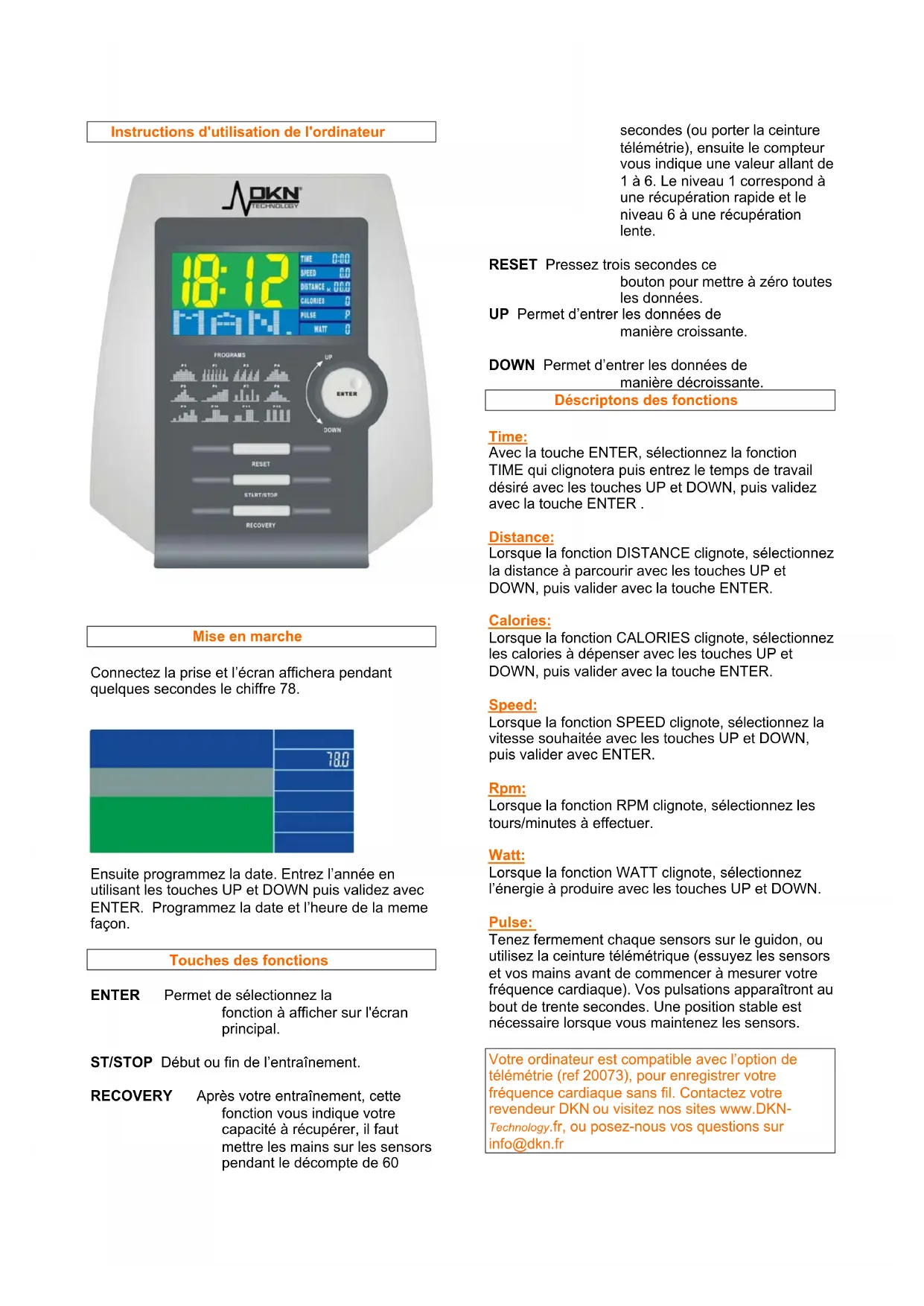 Votre ordinateur est compatible avec l'option de télémetrie (ref 20073), pour enregistrer votre fréquence cardiaque sans fil. Contactez vous revendeur DKN ou visitez nos sites www.DKN-Technology.fr, ou posez-nous vos questions sur info@dkn.fr