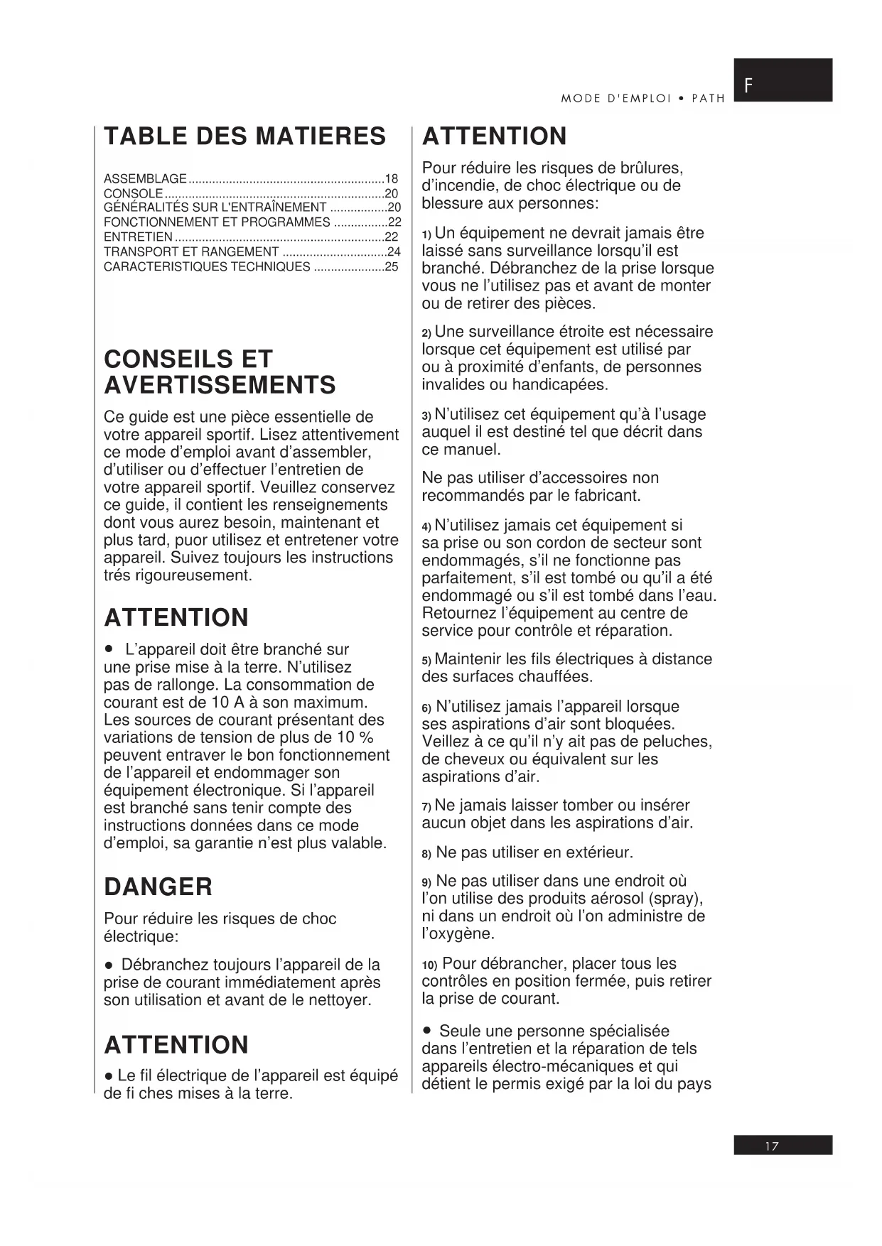 Ce guide est une pièce essentielle de votre appareil sportif. Lisez attentivement ce mode d'emploi avant d'assembler, d'utiliser ou d'effectuer l'entretien de votre appareil sportif. Veuillez conserver ce guide, il contient les renseignements dont vous aurez besoin, maintenant et plus tard, pour utiliser et entretenir votre appareil. Suivez toujours les instructions très rigoureusement.