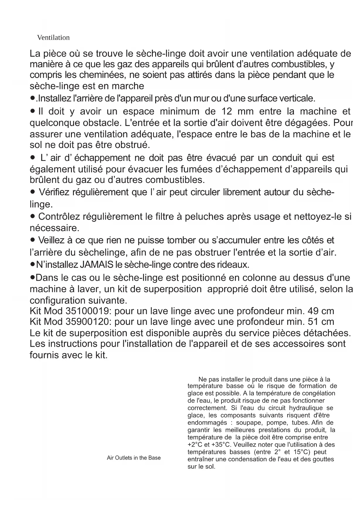 Rappels de sécurité Desagüe: Instrucciones de Colocación Preparación del material para secar Controles e indicadores Selección del programa Puerta y filtro Depósito del agua onctionnement Nettoyage et entretien de routine Dépistage de pannes Service clientèle0 EN6 Air Outlets in the Base La pièce où se trouve le sèche-linge doit avoir une ventilation adéquate de manière à ce que les gaz des appareils qui brûlent d’autres combustibles, y compris les cheminées, ne soient pas attirés dans la pièce pendant que le sèche-linge est en marche ●.Installez l'arrière de l'appareil près d'un mur ou d'une surface verticale. ● Il doit y avoir un espace minimum de 12 mm entre la machine et quelconque obstacle. L'entrée et la sortie d'air doivent être dégagées. Pour assurer une ventilation adéquate, l'espace entre le bas de la machine et le sol ne doit pas être obstrué. ● L’ air d’ échappement ne doit pas être évacué par un conduit qui est également utilisé pour évacuer les fumées d’échappement d’appareils qui brûlent du gaz ou d’autres combustibles. ● Vérifiez régulièrement que l’ air peut circuler librement autour du sèche- linge. ● Contrôlez régulièrement le filtre à peluches après usage et nettoyez-le si nécessaire. ● Veillez à ce que rien ne puisse tomber ou s’accumuler entre les côtés et l’arrière du sèchelinge, afin de ne pas obstruer l'entrée et la sortie d’air. ● N’installez JAMAIS le sèche-linge contre des rideaux. ●Dans le cas ou le sèche-linge est positionné en colonne au dessus d'une machine à laver, un kit de superposition approprié doit être utilisé, selon la configuration suivante. Kit Mod 35100019: pour un lave linge avec une profondeur min. 49 cm Kit Mod 35900120: pour un lave linge avec une profondeur min. 51 cm Le kit de superposition est disponible auprès du service pièces détachées. Les instructions pour l'installation de l'appareil et de ses accessoires sont fournis avec le kit. Ventilation 34 FR Ne pas installer le produit dans une pièce à la température basse où le risque de formation de glace est possible. A la température de congélation de l'eau, le produit risque de ne pas fonctionner correctement. Si l'eau du circuit hydraulique se glace, les composants suivants risquent d'être endommagés : soupape, pompe, tubes. Afin de garantir les meilleures prestations du produit, la température de la pièce doit être comprise entre +2°C et +35°C. Veuillez noter que l'utilisation à des températures basses (entre 2° et 15°C) peut entraîner une condensation de l'eau et des gouttes sur le sol.35 FR Protection De L'environnement Besoins Électriques ● Tous les matériaux de conditionnement utilisés sont écologiques et recyclables. Veuillez les éliminer de manière écologique. Votre municipalité pourra vous donner le détail exact des méthodes d’élimination en vigueur. ● Pour assurer la sécurité lors de l’élimination d’un vieux sèche-linge, veuillez débrancher la fiche du courant de secteur, couper le câble d’alimentation et le détruire avec la fiche. Pour empêcher que les enfants ne s’enfer-ment dans la machine, cassez les charnières de la porte ou son dispositif de verrouillage. Lorsque la machine est en place, les pieds doivent être ajustés pour mettre la machine de niveau. Ajustement Des Pieds ● Pour veiller au fonctionnement efficace et sans risque de cet appareil, nous vous recommandons de faire exclusivement appel à un technicien GIAS agréé pour son entretienou sa réparation éventuelle. Service GIAS Cet appareil est commercialisé en a c c o r d a v e c l a d i r e c t i v e européenne 2012/19/CE sur les d é ch e ts d es é q ui pe m en t s électriques et électroniques (DEEE). Les déchets des équipements électriques et électroniques (DEEE) contiennent des substances polluantes (ce qui peut entraîner de s co ns équ e nce s n é ga tiv e s p ou r l'environnement) et des composants de base (qui peuvent être réutilisés). Il est important de traiter ce type de déchets de manière appropriée afin de pouvoir éliminer correctement tous les polluants et de recycler les matériaux Les particuliers peuvent jouer un rôle important en veillant à ce que les DEEE ne deviennent pas un problème environnemental. Il est essentiel de suivre quelques règles simples : -Les DEEE ne doivent pas être traités comme les déchets ménagers -Les DEEE doivent être remis aux points de collecte enregistrés. Dans de nombreux pays, la collecte des produits gros électroménagers peut être effectuée à domicile. Dans de nombreux pays, lorsque vous achetez un nouvel appareil, l'ancien peut être retourné au détaillant qui doit collecter gratuitement sur la base un contre un. L'équipement repris doit être équivalent ou bien avoir les mêmes fonctions que le produit acquis. Directive Européenne 2012/19/CE Si l’appareil ne fonctionne pas correctement ou s’il tombe en panne, mettez-le à l’arrêt et débranchez-le du courant de secteur. Consultez le service GIAS pour prévoir une éventuelle réparation. Si le cordon électrique de cet appareil estendommagé, il doit être remplacé par un cordon spécial qui est UNIQUEMENT disponible auprès du service des pièces de rechange. Il doit être installé par une personne compétente. Un appel de service peut vous être facturé si la défaillance de votre appareil est causée par une installation incorrecte. Ne branchez pas l'appareil et ne mettez pas en marche l'interrupteur de secteur tant que l'installation n'est pas terminée. Par mesure de sécurité, veillez à installer ce sèche-linge correctement. En cas de doute concernant son installation, veuillez demander conseil à GIAS Service. Les sèche-linges sont prévues pour une tension monophasée de 220-240 V, 50 Hz. Vérifiez que la tension nominale du circuit d'alimentation est réglée sur 6A minimum. L’électricité peut 