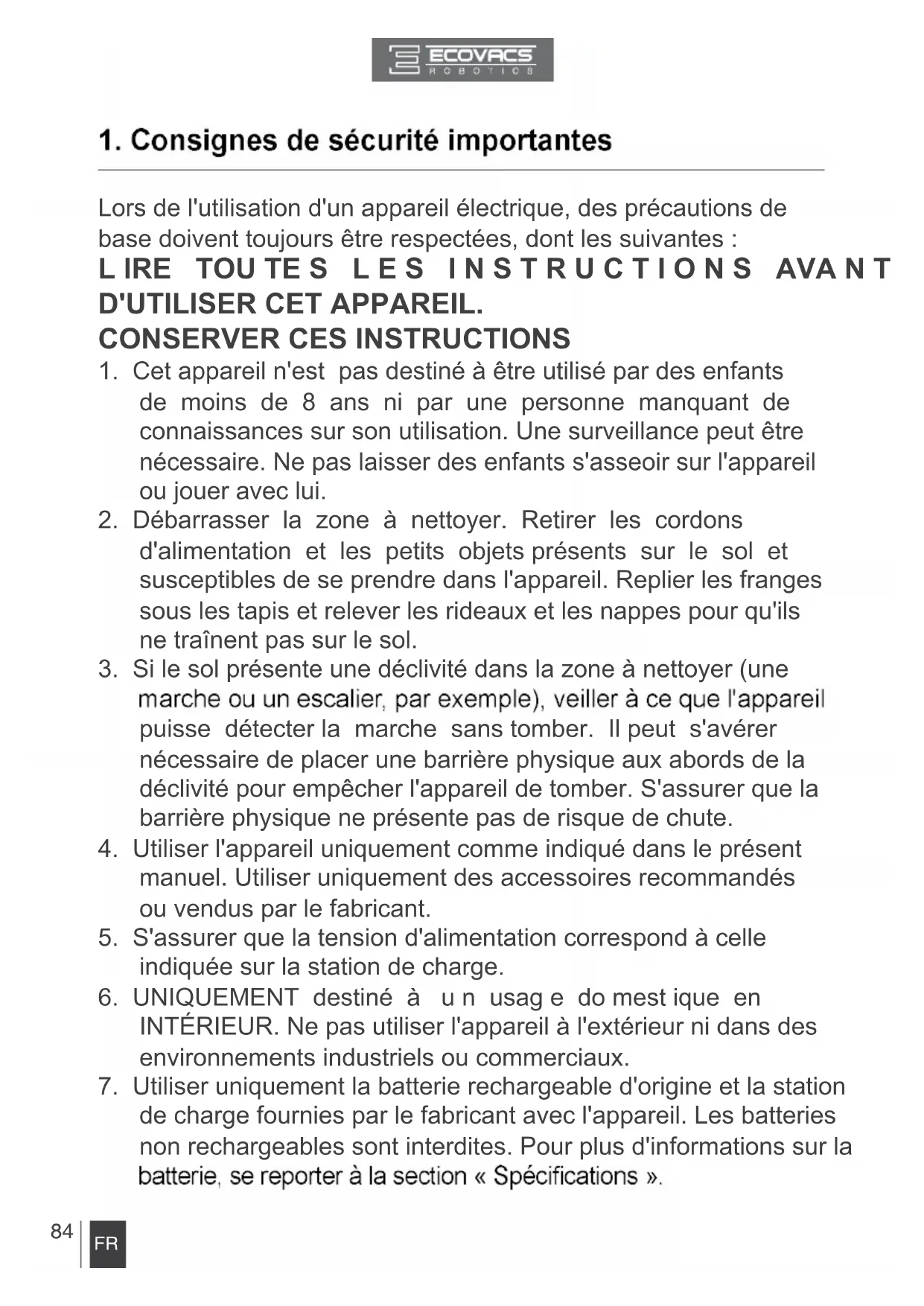 Félicitations pour l'achat de votre robot ECOVACS ROBOTICS DEEBOT ! Nous espérons qu'il vous apportera entière satisfaction pendant de nombreuses années. L'achat de ce nouveau robot vous aidera à entretenir votre maison et vous permettra de libérer du temps pour d'autres activités. Live Smart. Enjoy Life. Si vous êtes confronté à une situation qui n'a pas été correctement traitée dans ce manuel d'instructions, contactez le service clientèle. Nos techniciens se mettront à votre disposition pour résoudre votre problème ou répondre à une question particulière. www.ecovacs.com ou conceptuelles à ce produit pour en assurer l'amélioration continue. Merci d'avoir choisi DEEBOT !83