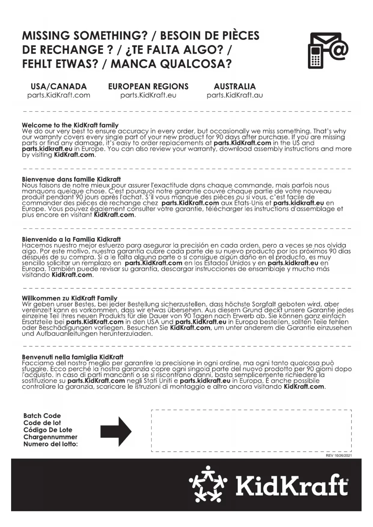 Nos faisons de notre mistré pour assurer l'exactitude dans chaque commande, mais parfois nous manquons quelque chose. C'est pourquoi notre garantie couvre chaque partie de votre nouveau produit pendant 90 jours après l'achat. S'il vous manque des pieces ou si vous, c'est facile de commander des pieces de rechange chez parts.KidKraft.com aux États-Unis et parts.kidkraft.eu en Europe. Vous pouvez également consulter votre garantie, télécharger les instructions d'assemblage et plus encore en visitant KidKraft.com.