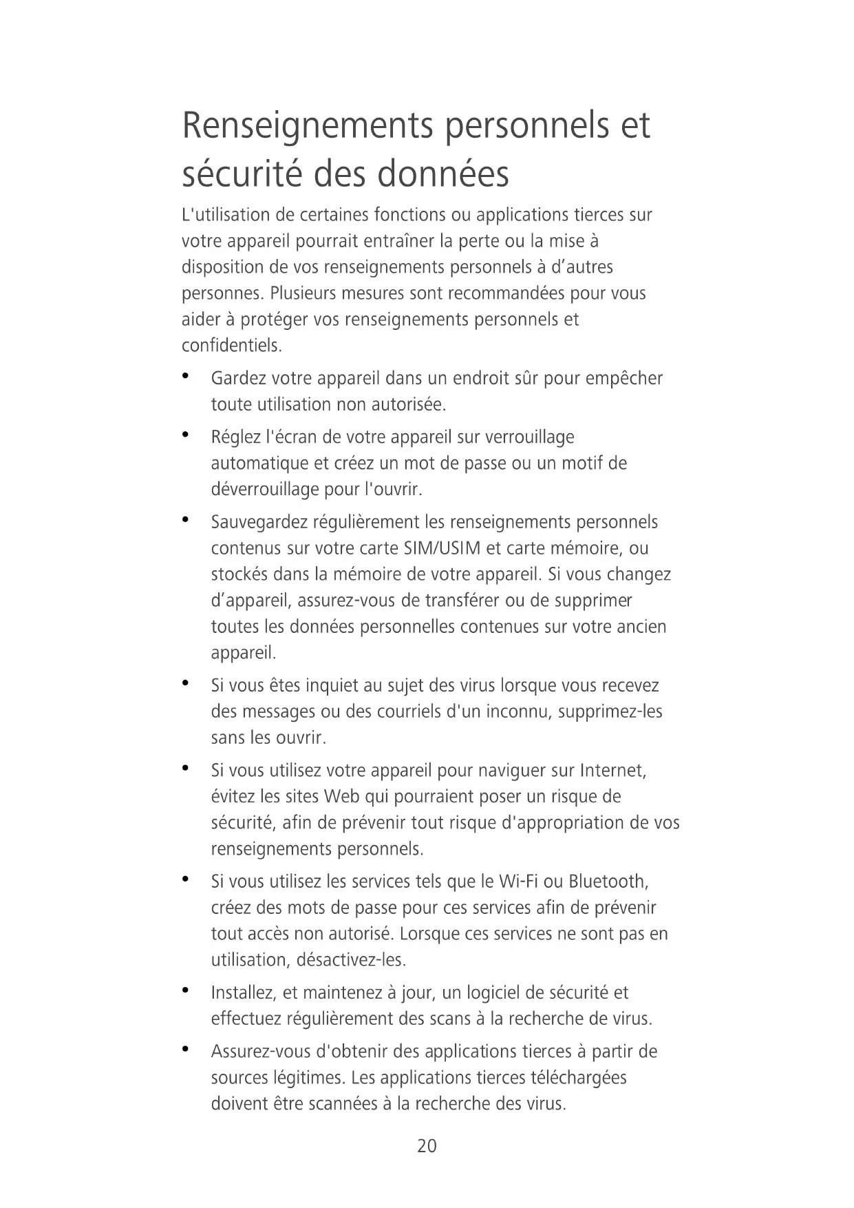 | Sécurité | Utiliser un mot de passe ou un schéma pour déverrouiller l'appareil, activer le chiffrement des données. |