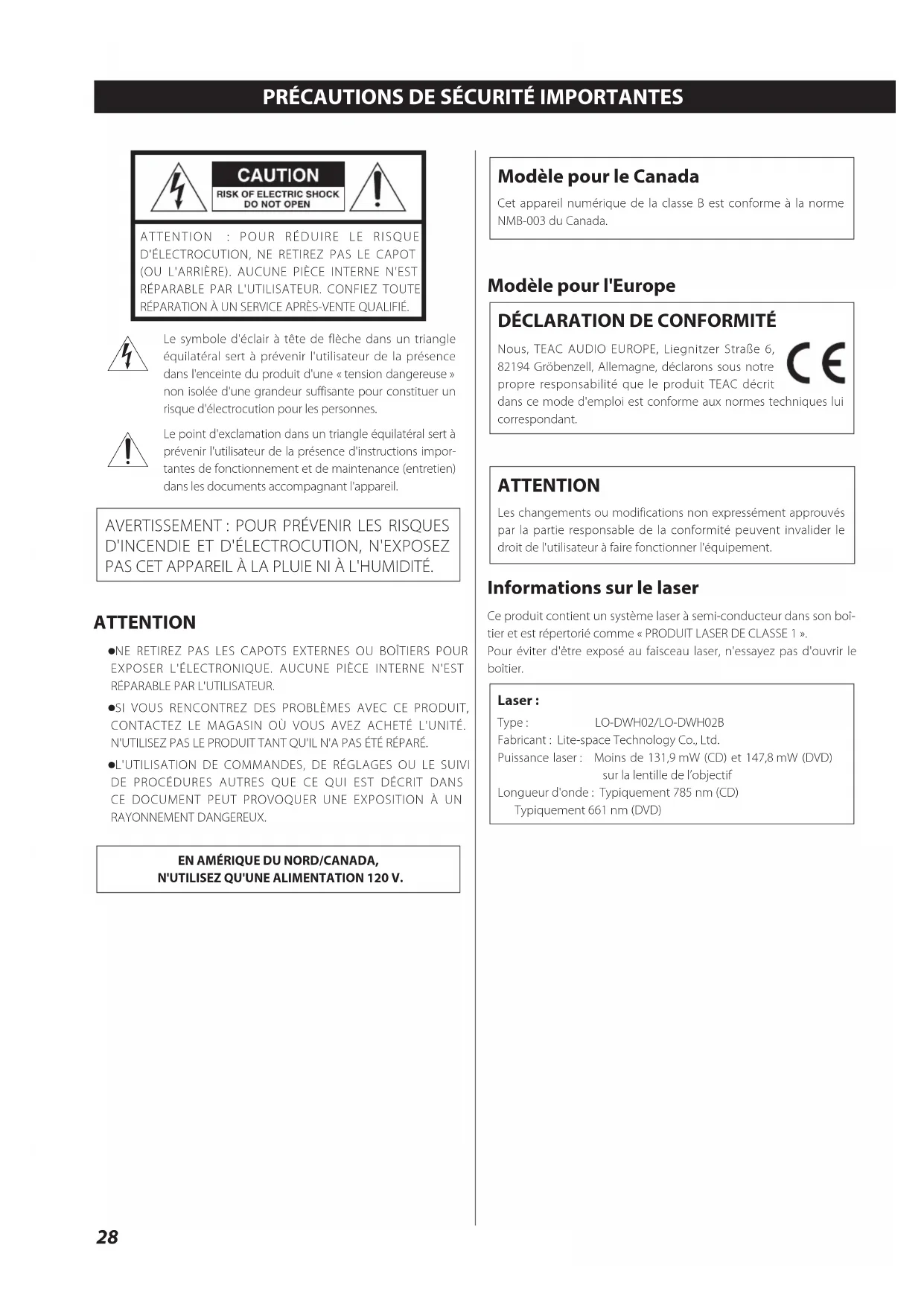 Nous, TEAC AUDIO EUROPE, Liegnitzer Straße 6, 82194 Grobenzell, Allemagne, déclarons sous notre propre responsabilité que le produit TEAC désrit dans ce mode d'emploi est conforme aux normes te correspondant.