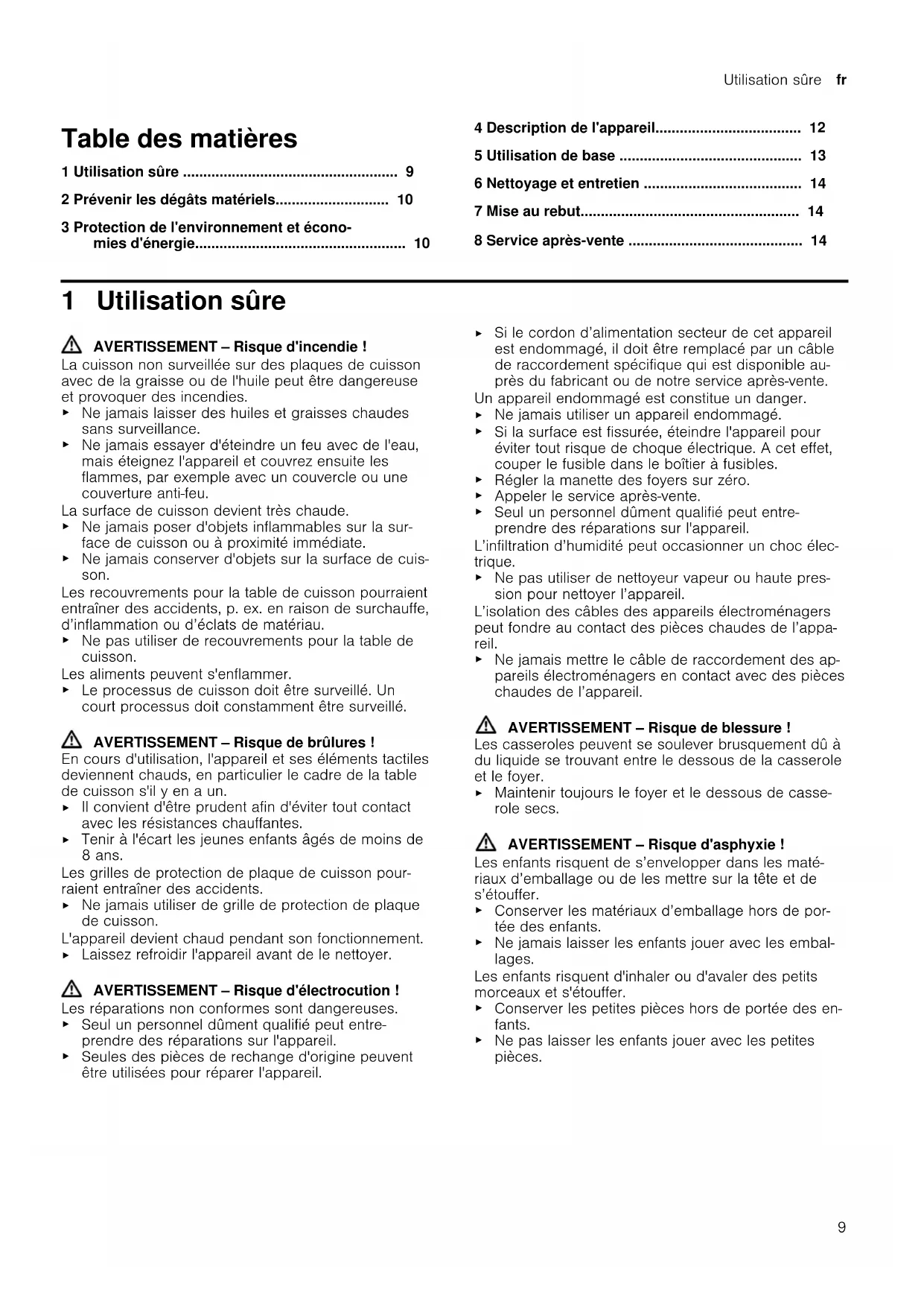 - 8 Service après-vente 1 Utilisation sûre AVERTISSEMENT‒Risque d'incendie! La cuisson non surveillée sur des plaques de cuisson avec de la graisse ou de l'huile peut être dangereuse et provoquer des incendies. p. 14