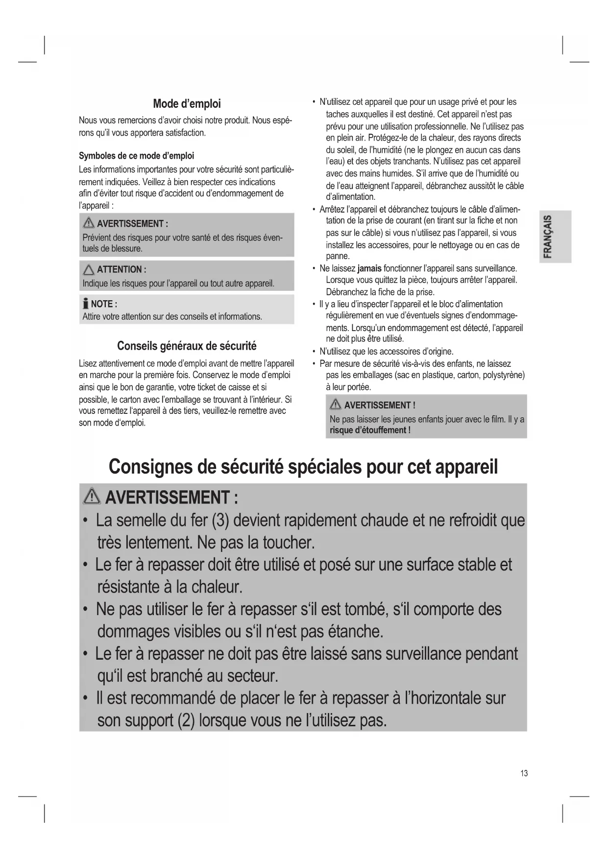 - Le fer à repasser doit être utilisé et posé sur une surface stable et résistante à la chaleur.