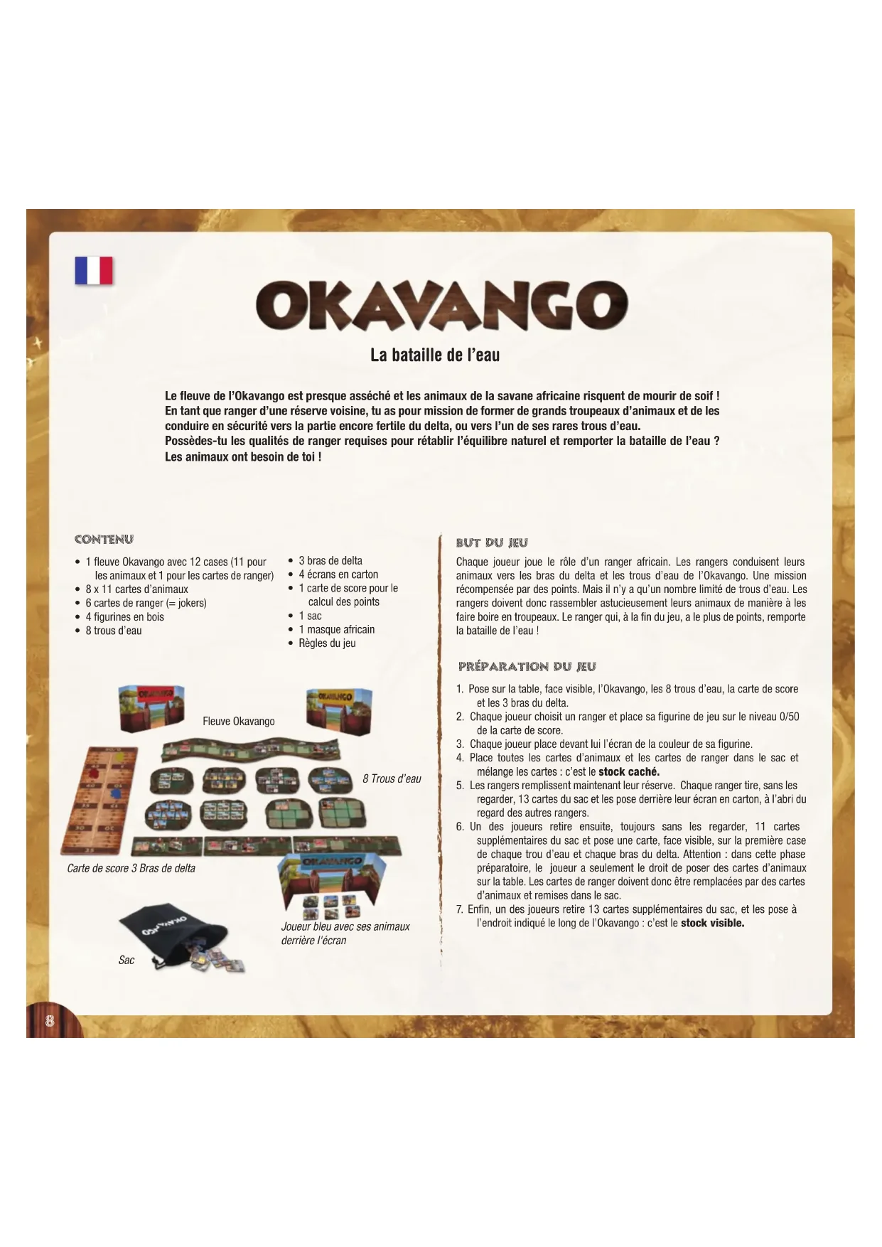 - 8 trous d’eau Chaque joueur joue le rôle d’un ranger africain. Les rangers conduisent leurs animaux vers les bras du delta et les trous d’eau de l’Okavango. Une mission récompensée par des points. Mais il n’y a qu’un nombre limité de trous d’eau. Les rangers doivent donc rassembler astucieusement leurs animaux de manière à les faire boire en troupeaux. Le ranger qui, à la fin du jeu, a le plus de points, remporte la bataille de l’eau !