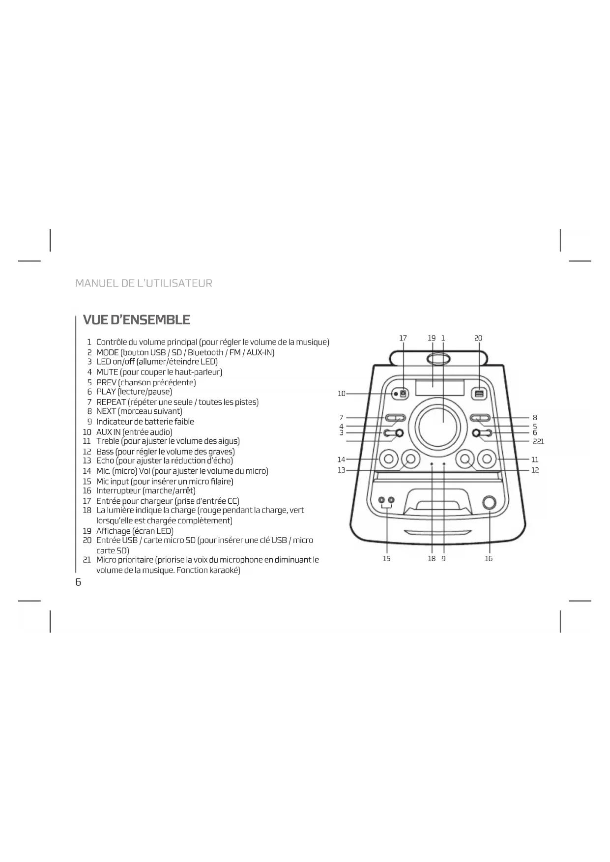 Contrôle du volume principal (pour régler le volume de la musique) MODE (bouton USB / SD / Bluetooth / FM / AUX-IN) LED on/off (allumer/éteindre LED) MUTE (pour couper le haut-parleur) PREV (chanson précédente) PLAY (lecture/pause) REPEAT (répéter une seule / toutes les pistes) NEXT (morceau suivant) Indicateur de batterie faible AUX IN (entrée audio) Treble (pour ajuster le volume des aigus) Bass (pour régler le volume des graves) Echo (pour ajuster la réduction d’écho) Mic. (micro) Vol (pour ajuster le volume du micro) Mic input (pour insérer un micro filaire) Interrupteur (marche/arrêt) Entrée pour chargeur (prise d’entrée CC) La lumière indique la charge (rouge pendant la charge, vert lorsqu’elle est chargée complètement) Affichage (écran LED) Entrée USB / carte micro SD (pour insérer une clé USB / micro carte SD) Micro prioritaire (priorise la voix du microphone en diminuant le volume de la musique. Fonction karaoké)