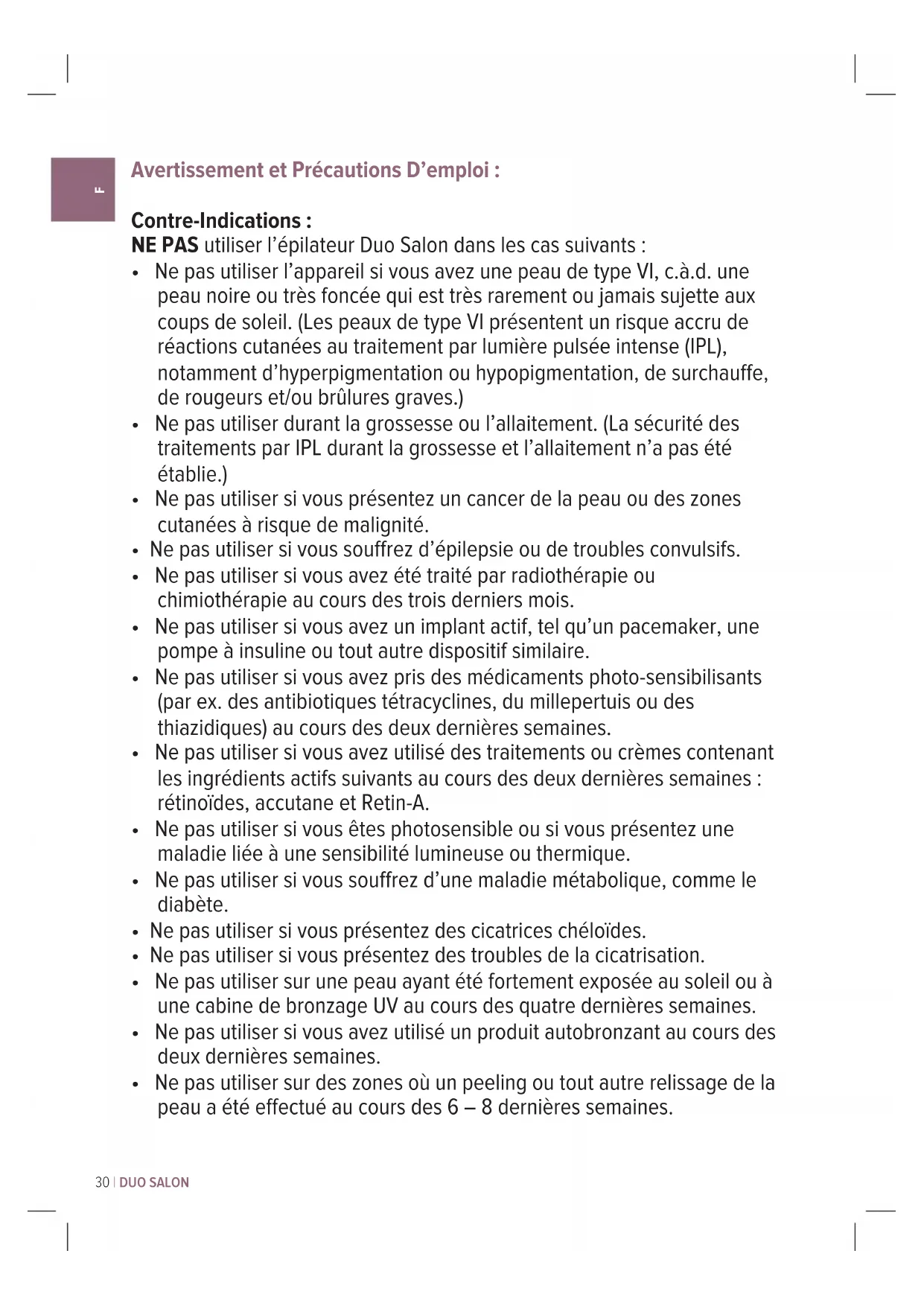 Avertissement et Précautions D’emploi : Contre-Indications : NE PAS utiliser l’épilateur Duo Salon dans les cas suivants :