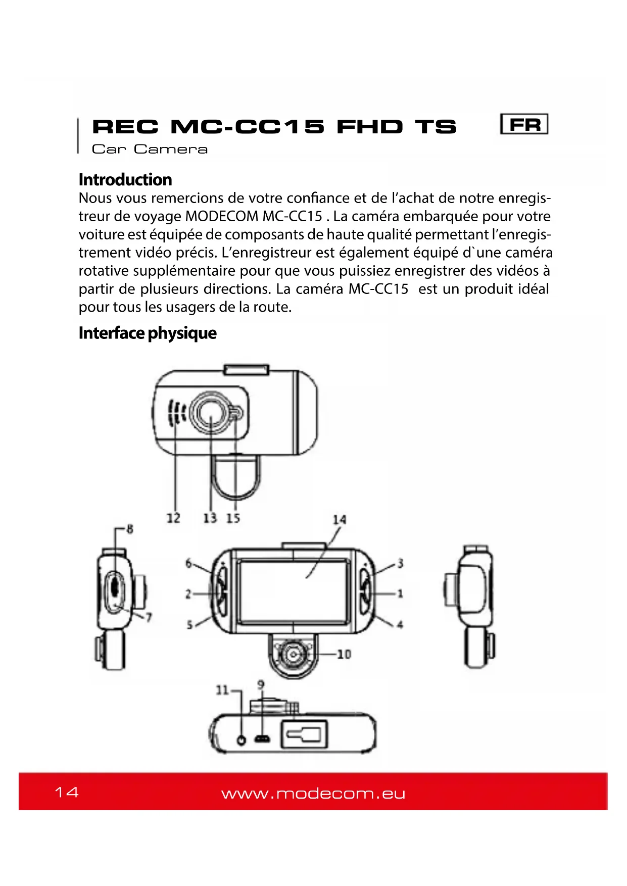 Nous vous remercions de votre confiance et de l'achat de notre enregistreur de voyage MODECOM MC-CC15. L'appareil embarqué pour votre voiture est équipé de composants de haute qualité permettant l'enregistrement vidéo précis. L'enregistreur est également équipé d'une caméra rotative supplémentaire pour que vous puissiez enregistrer des vidéos à partir de plusieurs directions. La caméra MC-CC15 est un produit idéal pour tous les usagers de la route.