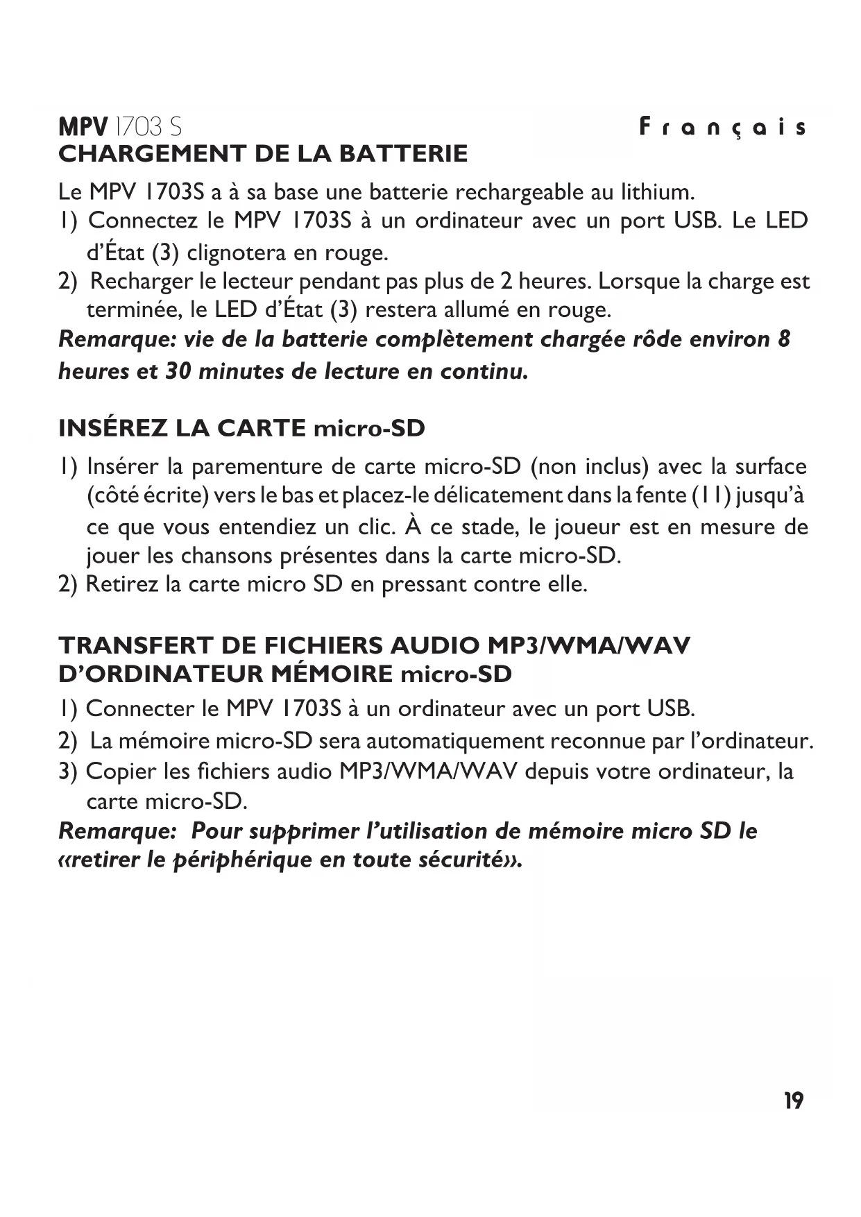 terminée, le LED d’État (3) restera allumé en rouge. Remarque: vie de la batterie complètement chargée rôde environ 8 heures et 30 minutes de lecture en continu. INSÉREZ LA CARTE micro-SD