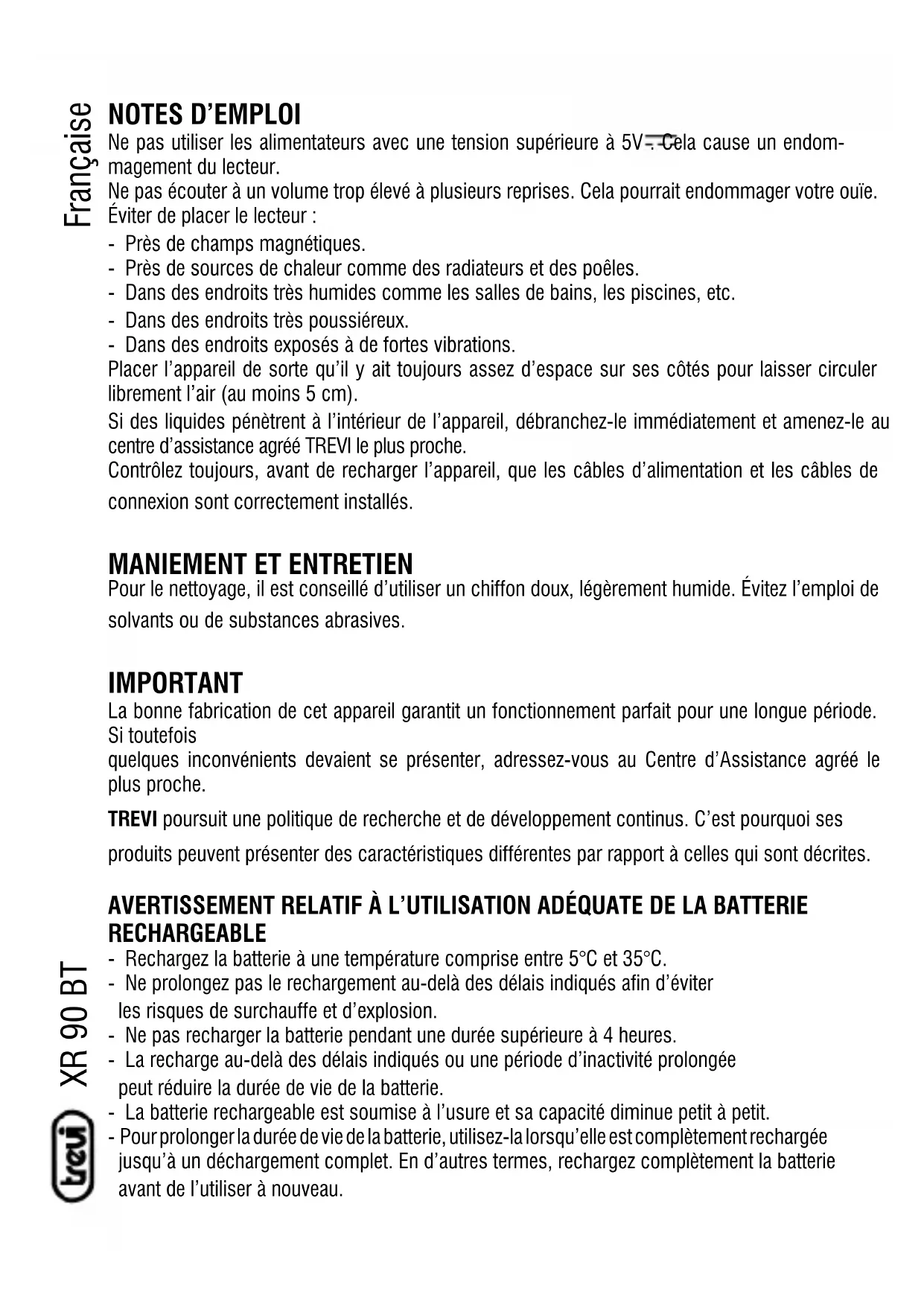 Pour le nettoyage, il est conseillé d’utiliser un chiffon doux, légèrement humide. Évitez l’emploi de solvants ou de substances abrasives. IMPORTANT La bonne fabrication de cet appareil garantit un fonctionnement parfait pour une longue période. Si toutefois quelques inconvénients devaient se présenter, adressez-vous au Centre d’Assistance agréé le plus proche. TREVI poursuit une politique de recherche et de développement continus. C’est pourquoi ses produits peuvent présenter des caractéristiques différentes par rapport à celles qui sont décrites. AVERTISSEMENT RELATIF À L’UTILISATION ADÉQUATE DE LA BATTERIE RECHARGEABLE - Rechargez la batterie à une température comprise entre 5°C et 35°C. - Ne prolongez pas le rechargement au-delà des délais indiqués afin d’éviter les risques de surchauffe et d’explosion. - Ne pas recharger la batterie pendant une durée supérieure à 4 heures. - La recharge au-delà des délais indiqués ou une période d’inactivité prolongée peut réduire la durée de vie de la batterie. - La batterie rechargeable est soumise à l’usure et sa capacité diminue petit à petit. - Pour prolonger la durée de vie de la batterie, utilisez-la lorsqu’elle est complètement rechargée jusqu’à un déchargement complet. En d’autres termes, rechargez complètement la batterie avant de l’utiliser à nouveau.XR 90 BT Française