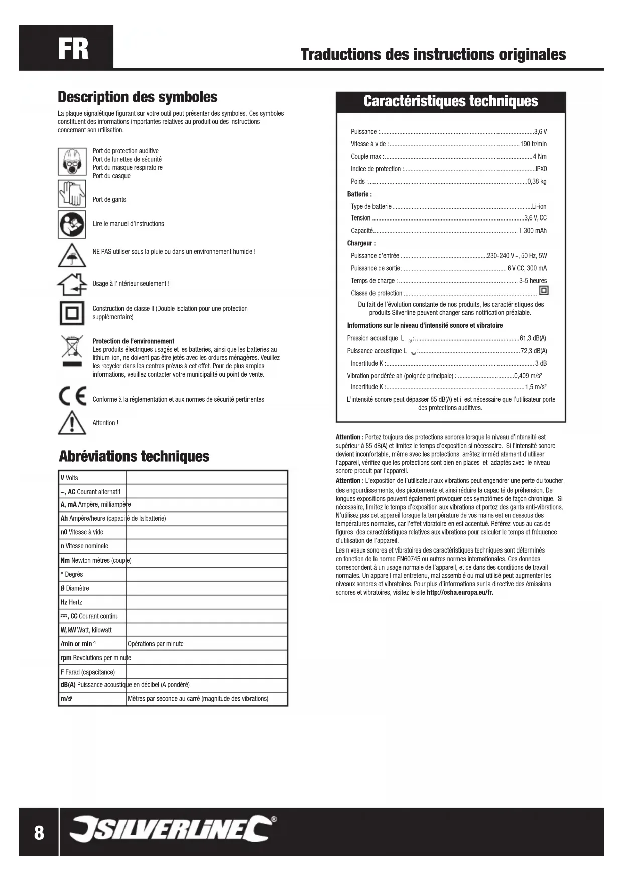 - ,409 m/s² Incertitude K : ,5 m/s² L’intensité sonore peut dépasser 85 dB(A) et il est nécessaire que l’utilisateur porte des protections auditives. Description des symboles La plaque signalétique figurant sur votre outil peut présenter des symboles. Ces symboles constituent des informations importantes relatives au produit ou des instructions concernant son utilisation. Port de protection auditive Port de lunettes de sécurité Port du masque respiratoire Port du casquePort de gantsLire le manuel d’instructions NE PAS utiliser sous la pluie ou dans un environnement humide !Usage à l’intérieur seulement !Construction de classe II (Double isolation pour une protection supplémentaire)Protection de l’environnement Les produits électriques usagés et les batteries, ainsi que les batteries au lithium-ion, ne doivent pas être jetés avec les ordures ménagères. Veuillez les recycler dans les centres prévus à cet effet. Pour de plus amples informations, veuillez contacter votre municipalité ou point de vente.Conforme à la réglementation et aux normes de sécurité pertinentesAttention !Attention : Portez toujours des protections sonores lorsque le niveau d’intensité est supérieur à 85 dB(A) et limitez le temps d’exposition si nécessaire. Si l’intensité sonore devient inconfortable, même avec les protections, arrêtez immédiatement d’utiliser l’appareil, vérifiez que les protections sont bien en places et adaptés avec le niveau sonore produit par l’appareil.Attention : L’exposition de l’utilisateur aux vibrations peut engendrer une perte du toucher, des engourdissements, des picotements et ainsi réduire la capacité de préhension. De longues expositions peuvent également provoquer ces symptômes de façon chronique. Si nécessaire, limitez le temps d’exposition aux vibrations et portez des gants anti-vibrations. N’utilisez pas cet appareil lorsque la température de vos mains est en dessous des températures normales, car l’effet vibratoire en est accentué. Référez-vous au cas de figures des caractéristiques relatives aux vibrations pour calculer le temps et fréquence d’utilisation de l’appareil.Les niveaux sonores et vibratoires des caractéristiques techniques sont déterminés en fonction de la norme EN60745 ou autres normes internationales. Ces données correspondent à un usage normale de l’appareil, et ce dans des conditions de travail normales. Un appareil mal entretenu, mal assemblé ou mal utilisé peut augmenter les niveaux sonores et vibratoires. Pour plus d’informations sur la directive des émissions sonores et vibratoires, visitez le site http://osha.europa.eu/fr. Traductions des instructions originales V Volts~, AC Courant alternatifA, mA Ampère, milliampèreAh Ampère/heure (capacité de la batterie)n0 Vitesse à viden Vitesse nominaleNm Newton mètres (couple)° DegrésØ DiamètreHz Hertz, CC Courant continuW, kW Watt, kilowatt/min or min Opérations par minuterpm Revolutions per minuteF Farad (capacitance)dB(A) Puissance acoustique en décibel (A pondéré) m/s p. 1