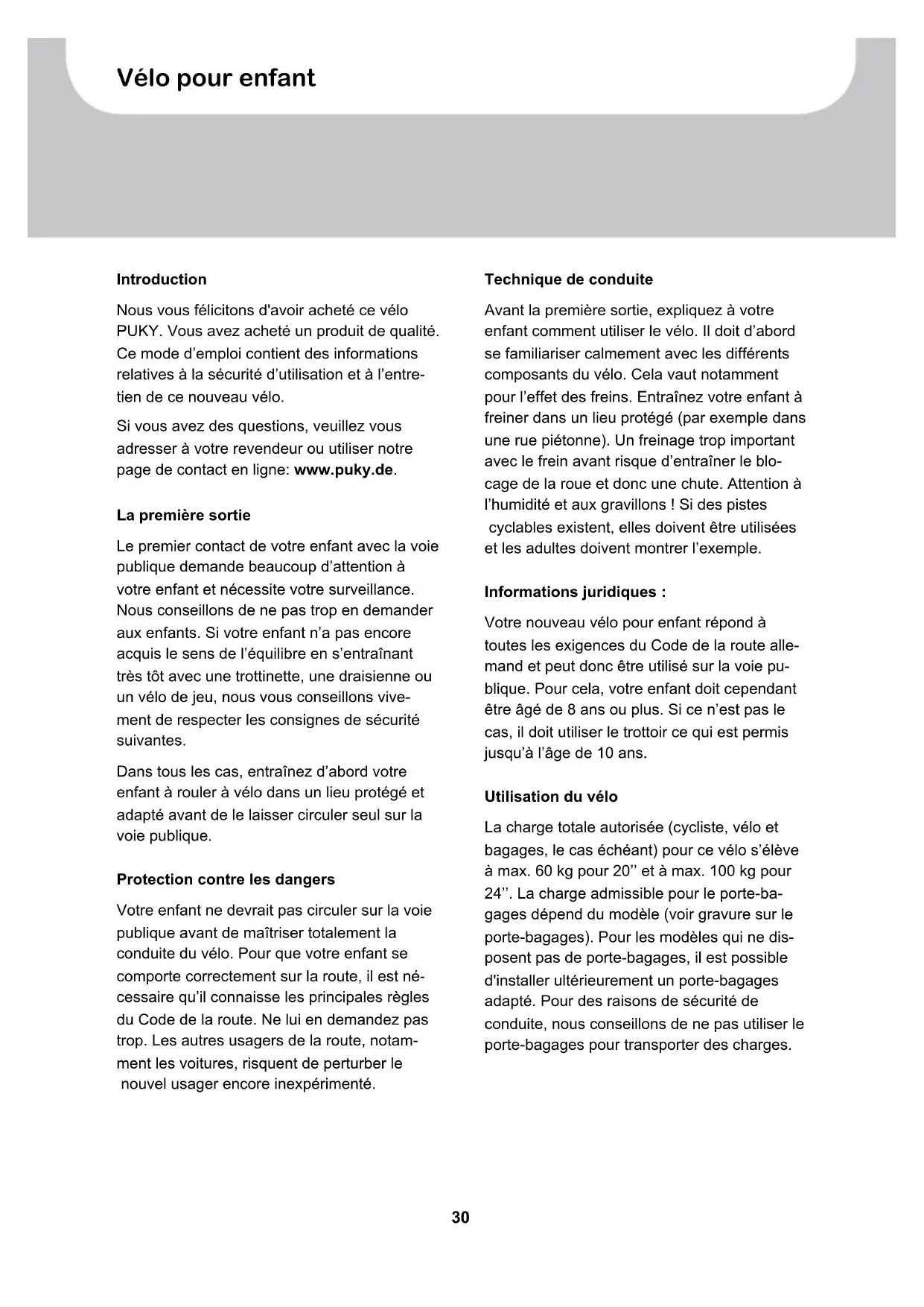 Nous vous félicitons d'avoir acheté ce vélo PUKY. Vous avez acheté un produit de qualité. Ce mode d'emploi contient des informations relatives à la sécurité d'utilisation et à l'entretien de ce nouveau vélo.
