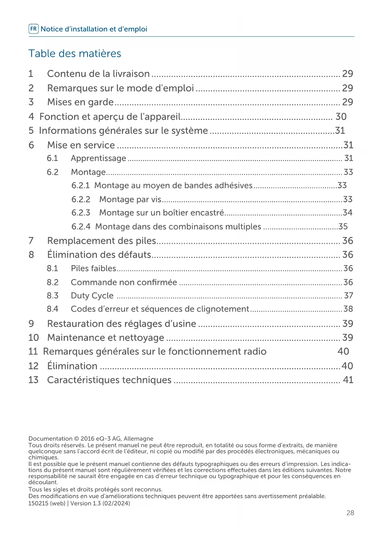 - Maximum radiated power: 10 dBm Receiver category: SRD category 2 Typ. open area RF range: 180 m Duty cycle: < 1 % per h/< 10 % per h Method of operation: Type 1 Degree of pollution: 2 Subject to technical changes.28 Documentation © 2016 eQ-3 AG, AllemagneTous droits réservés. Le présent manuel ne peut être reproduit, en totalité ou sous forme d’extraits, de manière quelconque sans l’accord écrit de l’éditeur, ni copié ou modifié par des procédés électroniques, mécaniques ou chimiques.Il est possible que le présent manuel contienne des défauts typographiques ou des erreurs d’impression. Les indica-tions du présent manuel sont régulièrement vérifiées et les corrections eectuées dans les éditions suivantes. Notre responsabilité ne saurait être engagée en cas d’erreur technique ou typographique et pour les conséquences en découlant.Tous les sigles et droits protégés sont reconnus.Des modifications en vue d’améliorations techniques peuvent être apportées sans avertissement préalable.150215 (web) | Version 1.3 (02/2024) Table des matières 1 Contenu de la livraison p. 29