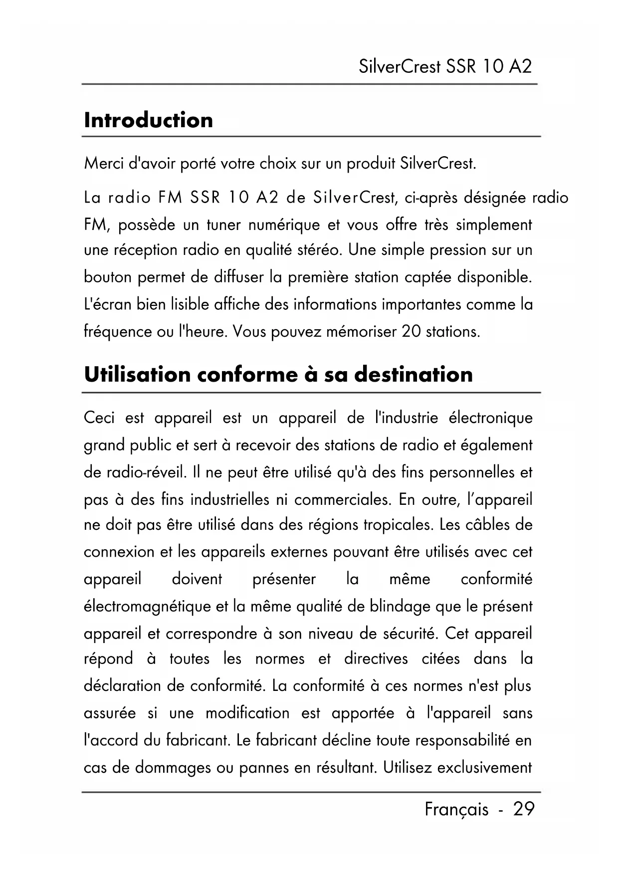 - Consignes de garantie SilverCrest SSR 10 A2 Français - 29 Introduction Merci d'avoir porté votre choix sur un produit SilverCrest. La radio FM SSR 10 A2 de SilverCrest, ci-après désignée radio FM, possède un tuner numérique et vous offre très simplement une réception radio en qualité stéréo. Une simple pression sur un bouton permet de diffuser la première station captée disponible. L'écran bien lisible affiche des informations importantes comme la fréquence ou l'heure. Vous pouvez mémoriser 20 stations. Utilisation conforme à sa destination Ceci est appareil est un appareil de l'industrie électronique grand public et sert à recevoir des stations de radio et également de radio-réveil. Il ne peut être utilisé qu'à des fins personnelles et pas à des fins industrielles ni commerciales. En outre, l’appareil ne doit pas être utilisé dans des régions tropicales. Les câbles de connexion et les appareils externes pouvant être utilisés avec cet appareil doivent présenter la même conformité électromagnétique et la même qualité de blindage que le présent appareil et correspondre à son niveau de sécurité. Cet appareil répond à toutes les normes et directives citées dans la déclaration de conformité. La conformité à ces normes n'est plus assurée si une modification est apportée à l'appareil sans l'accord du fabricant. Le fabricant décline toute responsabilité en cas de dommages ou pannes en résultant. Utilisez exclusivementSilverCrest SSR 10 A2 p. 53