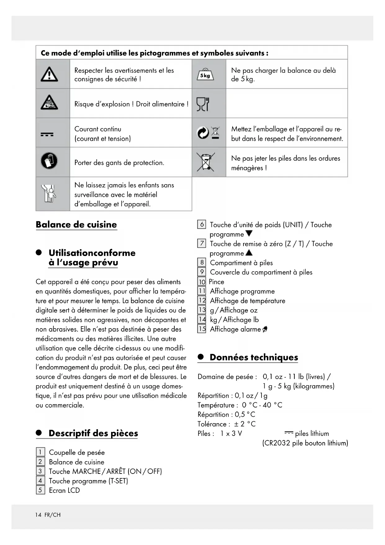 Données techniques Domaine de pesée : 0,1 oz - 11 lb (livres) / 1 g - 5 kg (kilogrammes) Répartition : 0,1 oz / 1g Température : 0 °C - 40 °C Répartition : 0,5 °C Tolérance : ± 2 °C Piles : 1 x 3 V piles lithium (CR2032 pile bouton lithium) Ce mode d‘emploi utilise les pictogrammes et symboles suivants : Respecter les avertissements et les consignes de sécurité ! 5 kg Ne pas charger la balance au delà de 5 kg. Risque d‘explosion ! Droit alimentaire ! Courant continu (courant et tension) Mettez l’emballage et l’appareil au re- but dans le respect de l’environnement. Porter des gants de protection. Ne pas jeter les piles dans les ordures ménagères ! Ne laissez jamais les enfants sans surveillance avec le matériel d’emballage et l’appareil.15 FR/CH