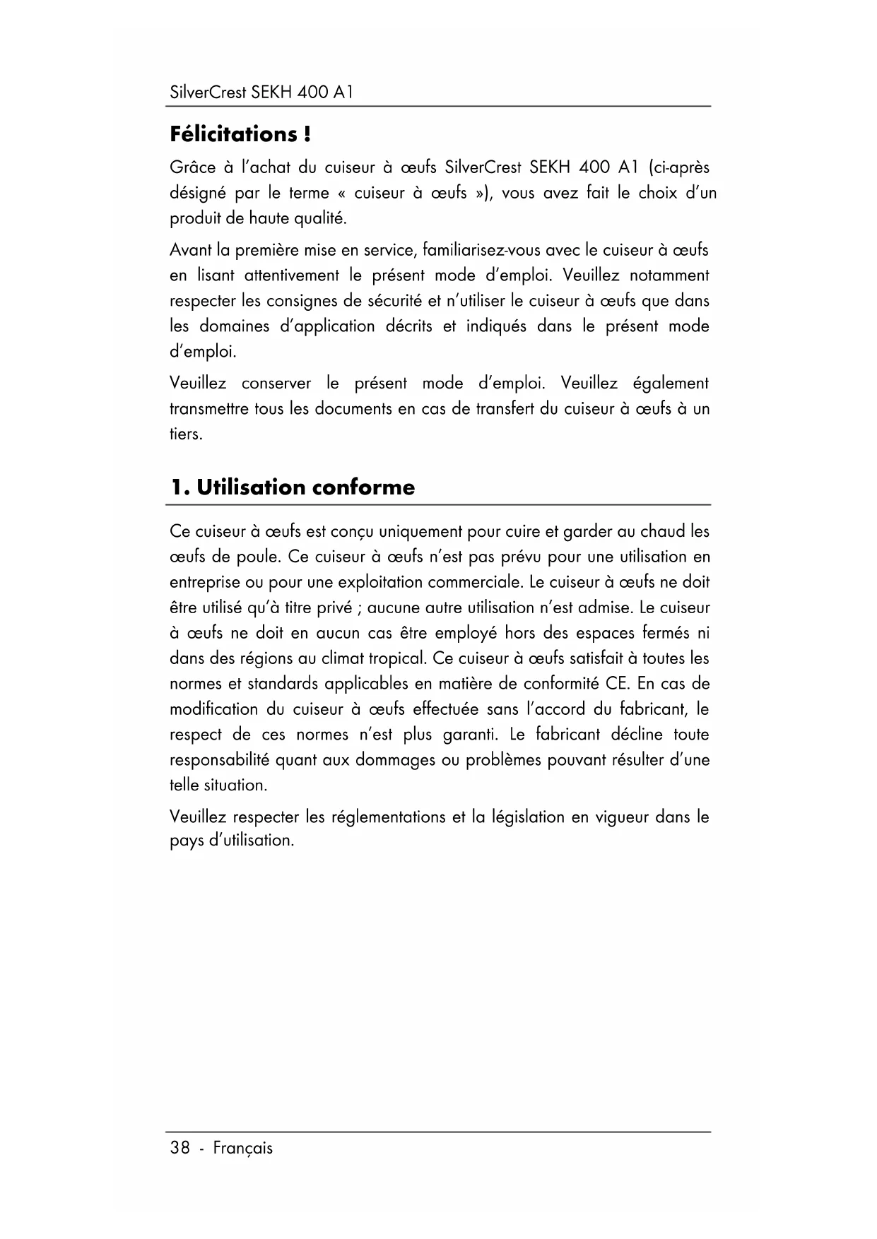 Ce cuiseur à œufs est conçu uniquement pour cuire et garder au chaud les œufs de poule. Ce cuiseur à œufs n’est pas prévu pour une utilisation en entreprise ou pour une exploitation commerciale. Le cuiseur à œufs ne doit être utilisé qu’à titre privé ; aucune autre utilisation n’est admise. Le cuiseur à œufs ne doit en aucun cas être employé hors des espaces fermés ni dans des régions au climat tropical. Ce cuiseur à œufs satisfait à toutes les normes et standards applicables en matière de conformité CE. En cas de modification du cuiseur à œufs effectuée sans l’accord du fabricant, le respect de ces normes n’est plus garanti. Le fabricant décline toute responsabilité quant aux dommages ou problèmes pouvant résulter d’une telle situation. Veuillez respecter les réglementations et la législation en vigueur dans le pays d’utilisation.SilverCrest SEKH 400 A1 Français - 39