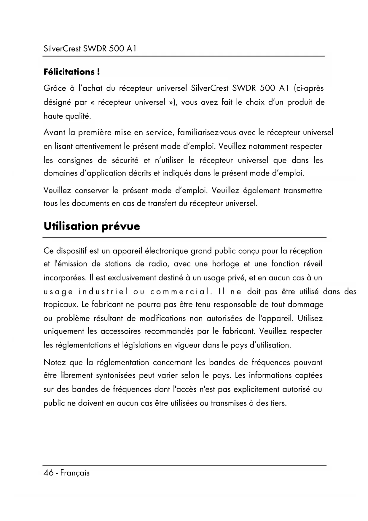 Félicitations ! Grâce à l’achat du récepteur universel SilverCrest SWDR 500 A1 (ci-après désigné par « récepteur universel »), vous avez fait le choix d’un produit de haute qualité. Avant la première mise en service, familiarisez-vous avec le récepteur universel en lisant attentivement le présent mode d’emploi. Veuillez notamment respecter les consignes de sécurité et n’utiliser le récepteur universel que dans les domaines d’application décrits et indiqués dans le présent mode d’emploi. Veuillez conserver le présent mode d’emploi. Veuillez également transmettre tous les documents en cas de transfert du récepteur universel. Utilisation prévue Ce dispositif est un appareil électronique grand public conçu pour la réception et l'émission de stations de radio, avec une horloge et une fonction réveil incorporées. Il est exclusivement destiné à un usage privé, et en aucun cas à un usage industriel ou commercial. Il ne doit pas être utilisé dans des climats tropicaux. Le fabricant ne pourra pas être tenu responsable de tout dommage ou problème résultant de modifications non autorisées de l'appareil. Utilisez uniquement les accessoires recommandés par le fabricant. Veuillez respecter les réglementations et législations en vigueur dans le pays d’utilisation. Notez que la réglementation concernant les bandes de fréquences pouvant être librement syntonisées peut varier selon le pays. Les informations captées sur des bandes de fréquences dont l'accès n'est pas explicitement autorisé au public ne doivent en aucun cas être utilisées ou transmises à des tiers.SilverCrest SWDR 500 A1 Français - 47 Contenu de l'emballage Sortez l’appareil et tous les accessoires de l’emballage. Retirez les matériaux d’emballage et vérifiez que toutes les pièces sont complètes et intactes. Si un ou plusieurs composants manquent ou sont endommagés, veuillez contacter le fabricant. A Radio multibande SilverCrest SWDR 500 A1 B Adaptateur secteur C Étui de transport D Écouteurs SWDR 500 A1 E Ce mode d’emploi (représenté par un dessin)SilverCrest SWDR 500 A1