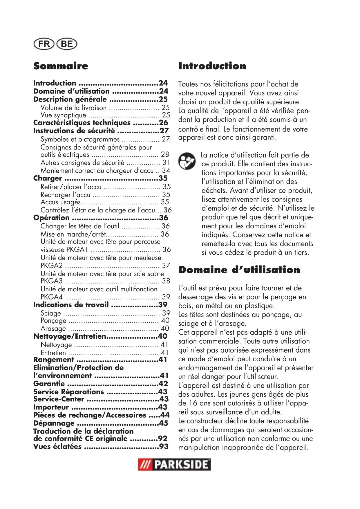 - Notice d’utilisation Vue synoptique 1 Retirer le mandrin à serrage rapide 2 Anneau de réglage du moment de rotation 3 Sélecteur de vitesse 4 Tête pour perceuse-visseuse PKGA1 5 Levier de déverrouillage pour têtes 6 Unité de moteur 7 Commutateur de sens de marche 8 Poignée 9 Accumulateur (accu) 10 Touche de déverrouillage batterie 11 Interrupteur marche/arrêt 12 Porte-embouts 13 Embouts de vissage, 50 mm, 6pièces 14 Embouts de perçage, 6 pièces 15 Chargeur 16 Boîte de rangement 17 Tête pour scie sabre PKGA3 18 Plaque d’appui 19 Levier de déverrouillage de la lame 20 Lame à métaux 21 Lame à bois 22 Plaque à poncer 23 Tête pour meuleuse PKGA2 24 5 feuilles abrasives 25 Adaptateur pour l’aspiration des poussières 26 Tête pour outil multifonction PKGA4 27 Levier de déverrouillage de l’outil 28 Mandrin porte-pièce 29 Porte-outil 30 Plateau de ponçage triangulaire 31 3 feuilles abrasives 32 Grattoir 33 Lame de scie plongeanteFR