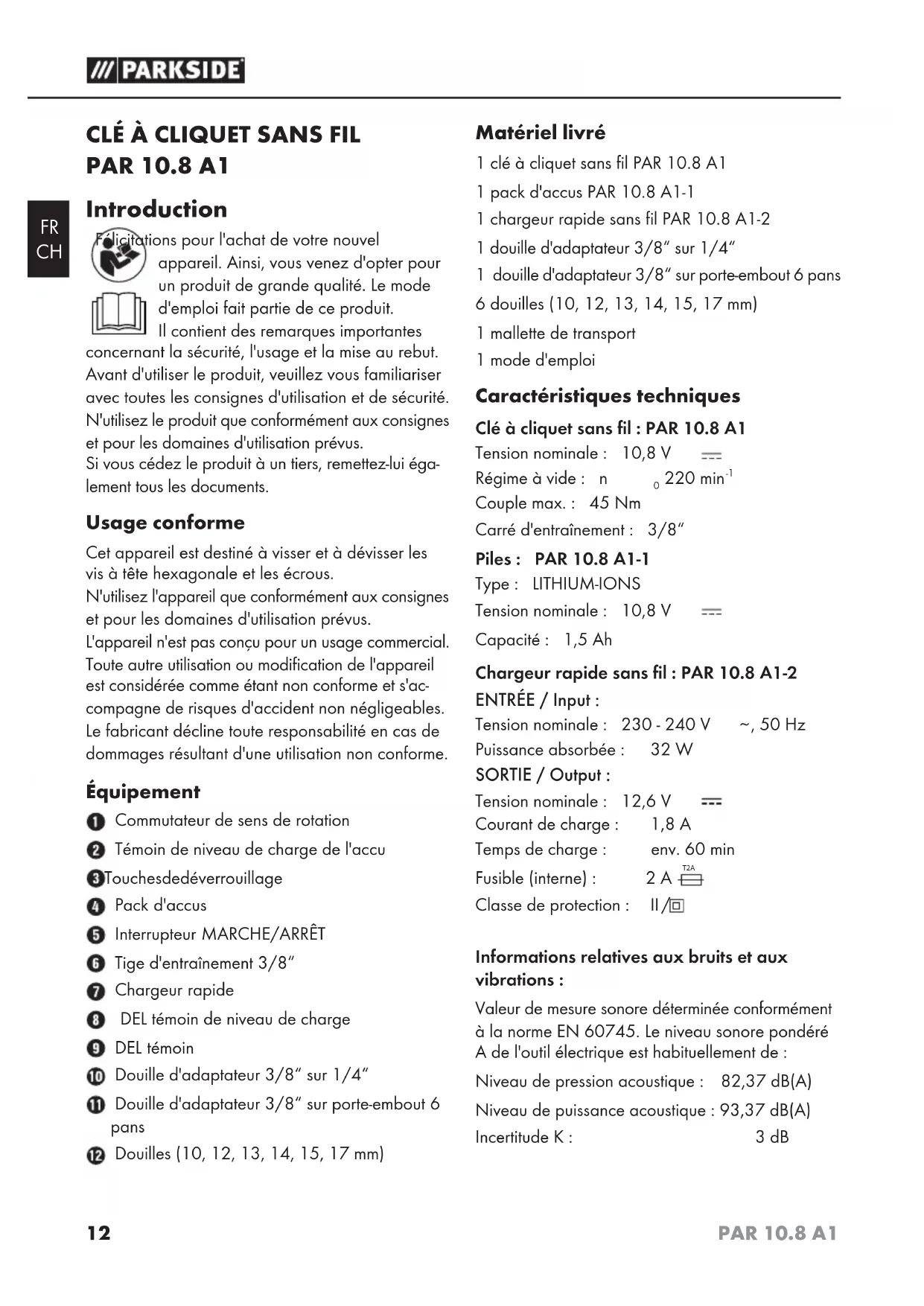 , 50 Hz Puissance absorbée: 32 W SORTIE / Output: Tension nominale: 12,6 V Courant de charge : 1,8 A Temps de charge: env. 60 min Fusible (interne) : 2 A T2A Classe de protection: II / Informations relatives aux bruits et aux vibrations: Valeur de mesure sonore déterminée conformément à la norme EN60745. Le niveau sonore pondéré A de l'outil électrique est habituellement de: Niveau de pression acoustique: 82,37 dB(A) Niveau de puissance acoustique: 93,37 dB(A) Incertitude K: 3 dB13 PAR 10.8 A1