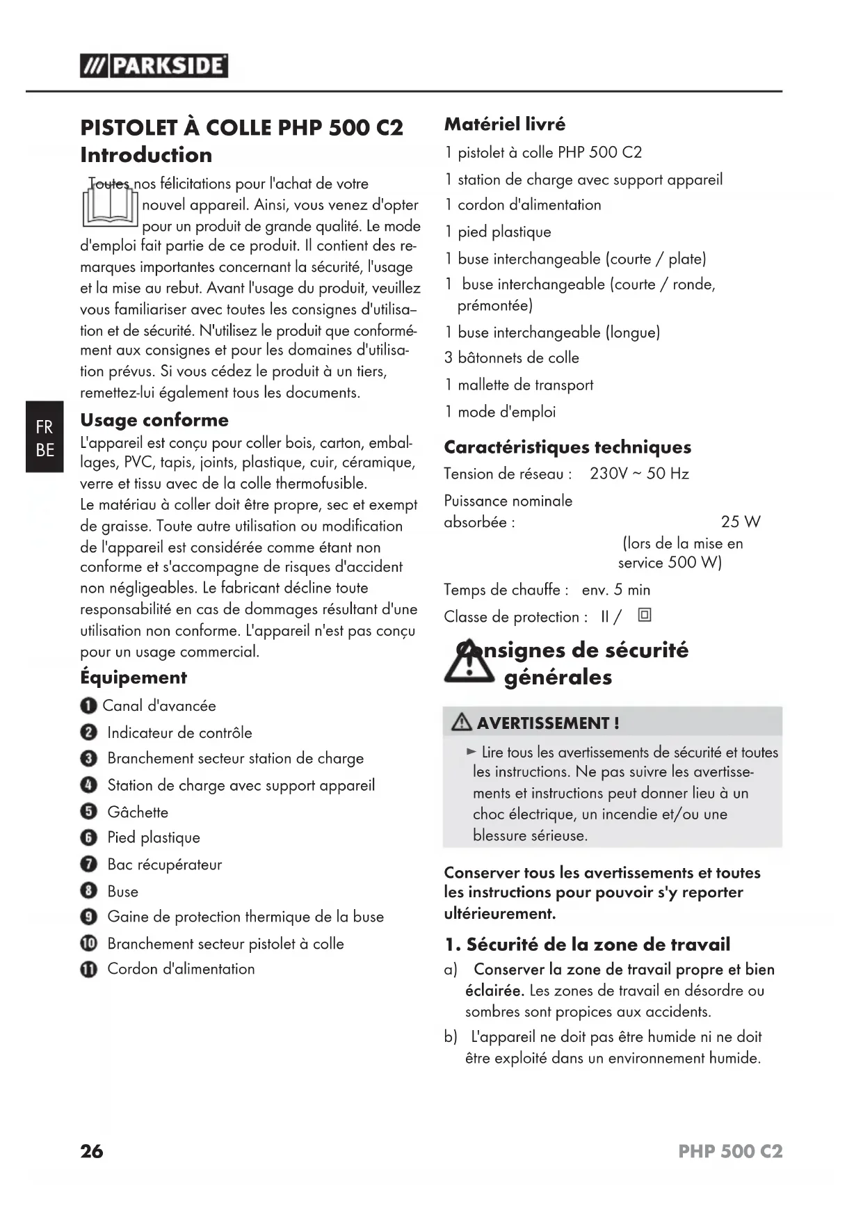 Introduction Toutes nos félicitations pour l'achat de votre nouvel appareil. Ainsi, vous venez d'opter pour un produit de grande qualité. Le mode d'emploi fait partie de ce produit. Il contient des re- marques importantes concernant la sécurité, l'usage et la mise au rebut. Avant l'usage du produit, veuillez vous familiariser avec toutes les consignes d'utilisa-- tion et de sécurité. N'utilisez le produit que conformé- ment aux consignes et pour les domaines d'utilisa- tion prévus. Si vous cédez le produit à un tiers, remettez-lui également tous les documents. Usage conforme L'appareil est conçu pour coller bois, carton, embal- lages, PVC, tapis, joints, plastique, cuir, céramique, verre et tissu avec de la colle thermofusible. Le matériau à coller doit être propre, sec et exempt de graisse. Toute autre utilisation ou modification de l'appareil est considérée comme étant non conforme et s'accompagne de risques d'accident non négligeables. Le fabricant décline toute responsabilité en cas de dommages résultant d'une utilisation non conforme. L'appareil n'est pas conçu pour un usage commercial. Équipement Canal d'avancée Indicateur de contrôle Branchement secteur station de charge Station de charge avec support appareil Gâchette Pied plastique Bac récupérateur Buse Gaine de protection thermique de la buse Branchement secteur pistolet à colle Cordon d'alimentation Matériel livré 1 pistolet à colle PHP 500 C2 1 station de charge avec support appareil 1 cordon d'alimentation 1 pied plastique 1 buse interchangeable (courte / plate) 1 buse interchangeable (courte / ronde, prémontée) 1 buse interchangeable (longue) 3 bâtonnets de colle 1 mallette de transport 1 mode d'emploi Caractéristiques techniques Tension de réseau: 230V ∼ 50 Hz Puissance nominale absorbée: 25W (lors de la mise en service 500 W) Temps de chauffe : env. 5 min Classe de protection: II / Consignes de sécurité générales AVERTISSEMENT! ► Lire tous les avertissements de sécurité et toutes les instructions. Ne pas suivre les avertisse- ments et instructions peut donner lieu à un choc électrique, un incendie et/ou une blessure sérieuse. Conserver tous les avertissements et toutes les instructions pour pouvoir s'y reporter ultérieurement.