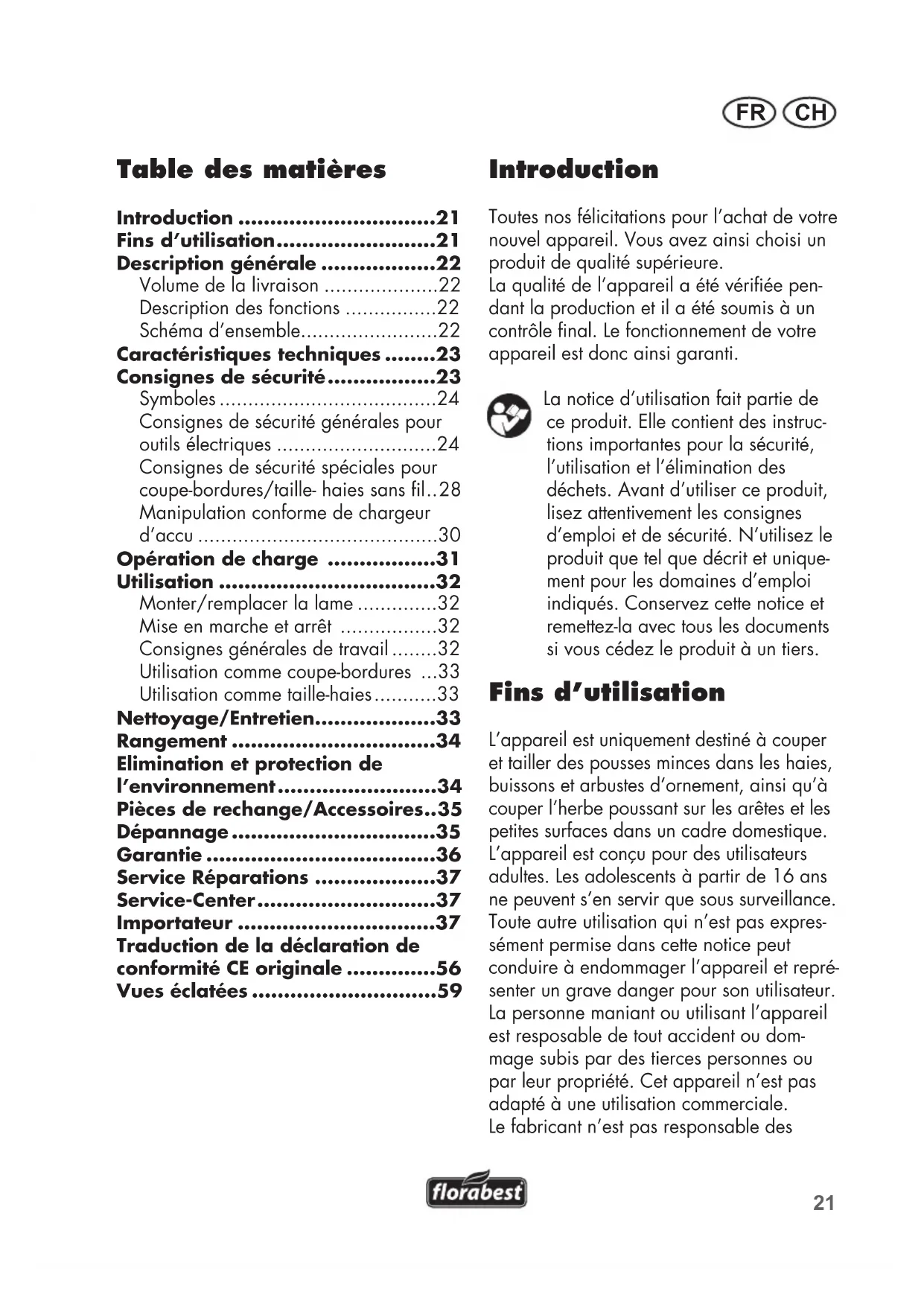 - DE AT CH21 CHFR Introduction Toutes nos félicitations pour l’achat de votre nouvel appareil. Vous avez ainsi choisi un produit de qualité supérieure. La qualité de l’appareil a été vériée pen- dant la production et il a été soumis à un contrôle nal. Le fonctionnement de votre appareil est donc ainsi garanti. La notice d’utilisation fait partie de ce produit. Elle contient des instruc- tions importantes pour la sécurité, l’utilisation et l’élimination des déchets. Avant d’utiliser ce produit, lisez attentivement les consignes d’emploi et de sécurité. N’utilisez le produit que tel que décrit et unique- ment pour les domaines d’emploi indiqués. Conservez cette notice et remettez-la avec tous les documents si vous cédez le produit à un tiers. Fins d’utilisation L’appareil est uniquement destiné à couper et tailler des pousses minces dans les haies, buissons et arbustes d’ornement, ainsi qu’à couper l’herbe poussant sur les arêtes et les petites surfaces dans un cadre domestique. L’appareil est conçu pour des utilisateurs adultes. Les adolescents à partir de 16ans ne peuvent s’en servir que sous surveillance. Toute autre utilisation qui n’est pas expres- sément permise dans cette notice peut conduire à endommager l’appareil et repré- senter un grave danger pour son utilisateur. La personne maniant ou utilisant l’appareil est resposable de tout accident ou dom- mage subis par des tierces personnes ou par leur propriété. Cet appareil n’est pas adapté à une utilisation commerciale. Le fabricant n’est pas responsable des Table des matières Introduction p. 21
