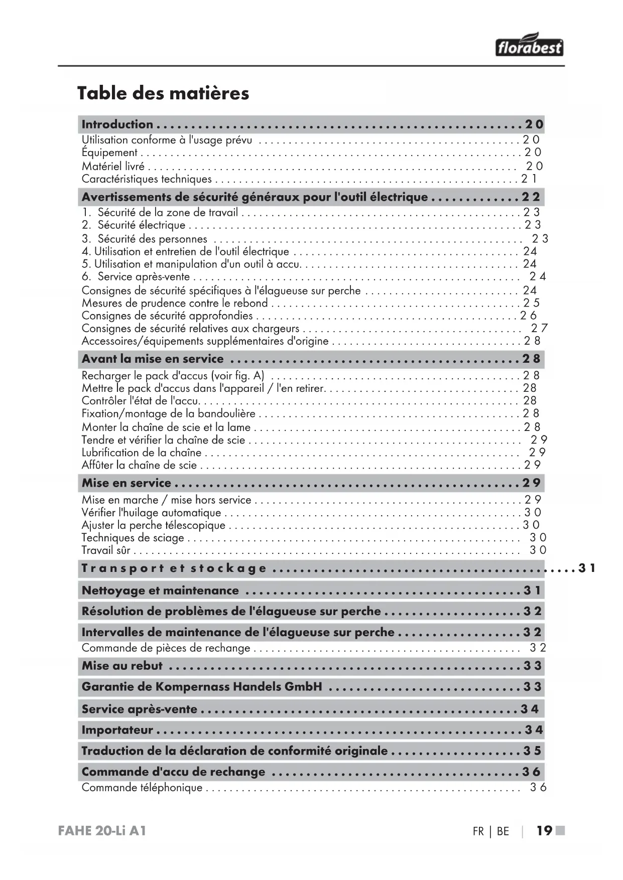 FAHE 20Li A1 - Taille-haies FLORABEST - Notice d'utilisation et mode d'emploi gratuit