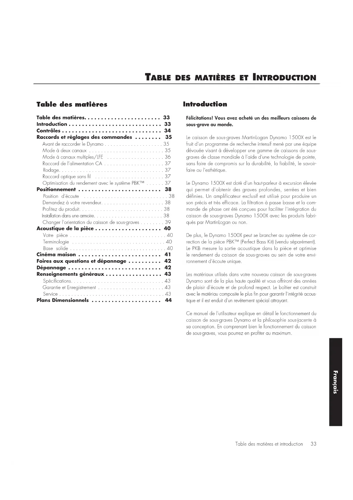 - Plans Dimensionnels Introduction Félicitations! Vous avez acheté un des meilleurs caissons de sous-grave au monde.Le caisson de sous-graves MartinLogan Dynamo 1500X est le fruit d’un programme de recherche intensif mené par une équipe dévouée visant à développer une gamme de caissons de sous-graves de classe mondiale à l’aide d’une technologie de pointe, sans faire de compromis sur la durabilité, la fiabilité, le savoir-faire ou l’esthétique.Le Dynamo 1500X est doté d’un haut-parleur à excursion élevée qui permet d’obtenir des graves profondes, serrées et bien définies. Un amplificateur exclusif est utilisé pour produire un son précis et très efficace. La filtration à passe basse et la com-mande de phase ont été conçues pour faciliter l’intégration du caisson de sous-graves Dynamo 1500X avec les produits fabri-qués par MartinLogan ou non.De plus, le Dynamo 1500X peut se brancher au système de cor-rection de la pièce PBK™ (Perfect Bass Kit) (vendu séparément). Le PKB mesure la sortie acoustique dans la pièce et optimise le rendement du caisson de sous-graves au sein de votre envi-ronnement d’écoute unique.Les matériaux utilisés dans votre nouveau caisson de sous-graves Dynamo sont de la plus haute qualité et vous offriront des années de plaisir d’écoute et de profond respect. Le boîtier est construit avec le matériau composite le plus fin pour garantir l’intégrité acous-tique et il est enduit d’un revêtement spécial attrayant. Ce manuel de l’utilisateur explique en détail le fonctionnement du caisson de sous-graves Dynamo et la philosophie sous-jacente à sa conception. En comprenant bien le fonctionnement du caisson de sous-graves, vous pourrez en profiter au maximum. Français34 Contrôles Bouton de niveau (fig. 1) Si vous réglez le niveau trop haut, les graves sembleront gon- flées; c’est la cause la plus courante de caissons de sous-graves qui offrent un mauvais son. Une règle pratique stipule que le caisson de sous-graves ne doit pas attirer l’attention sur lui et qu’il doit simplement faire en sorte que les graves du système soi- ent plus étendues et plus précises. Bouton de filtre de passe basse (fig. 1) Lorsque le caisson de sous-graves est raccordé en mode à canaux multiples (via LFE), L’interrupteur de raccord doit être réglé à « Contournement » (Bypass) afin que le filtre e passe basse ne soit plus actif et que le processeur traite la gestion des graves. Dans le cas d’une connexion à 2 canaux (via entrée gauche/ droite), en règle générale, le filtre de passe basse doit être réglé à environ 70 % de la fréquence de réponse la plus basse de l’enceinte. N’oubliez pas qu’il s’agit d’une règle générale. Pour votre information, une fois que vous avez essayé le réglage recom- mandé à l’aide de la formule susmentionnée, vous devez essayer les autres réglages pour voir ceux qui offrent le meilleur son. Bouton de commande de la phase (fig. 1) La commande de la phase dépend entièrement de la taille et de la configuration de votre environnement d’écoute, du posi- tionnement de l’appareil et de la disposition des sièges. En raison de la façon selon laquelle les ondes sonores des graves se développent dans les différentes pièces, il n’existe aucune règle générale pour régler la phase. Par exemple, si la pièce a une crête dans la zone du répartiteur du caisson de sous- graves, il est recommandé de régler la phase de façon à ce que les sorties acoustiques réelles du caisson de sous-graves et les enceintes principales soient déphasées. Expérimentez, essayez différents réglages et soyez patient. DEL de statut (fig. 1) Lorsque la DEL de statut est bleue, le caisson de sous-graves est allumé. La DEL sera éteinte en mode veille ou lorsque l’appareil est débranché. Power Mode (mode alimentation) et Trigger Input (entrée déclencheur) (fig. 2) Lorsqu’il est réglé à « Auto », le caisson de sous-graves s’allume quand il détecte un signal audio. Après quelques minutes d’inactivité, le caisson de sous-graves bascule en mode veille. Si vous avez un composant source externe (comme un récepteur AV) doté de commandes de déclenchement intégrées, vous pouvez allumer et éteindre le caisson de sous-graves avec cette source. Raccordez un câble du composant de commande au caisson de sous-graves et réglez cet interrupteur à « Trigger » (déclencheur). Bien que cette technologie soit couramment appelée déclencheur 12V, le Dynamo 1500X répondra à tout signal de 5 à 24V CC. Contrôles Figure 1. Contrôles du Dynamo 1500X. Figure 2. Contrôles et raccords du Dynamo 1500X. FrançaisRaccords et réglages des commandes 35 Avant de raccorder le Dynamo L’équipe de conception et de développement de MartinLogan a développé le Dynamo de façon à ce qu’il soit facile à configurer et à intégrer. Avant de raccorder le Dynamo, veuillez examiner les commandes expliquées à la dernière section. Une bonne compréhension de ces commandes accélérera la connexion et l’intégration du Dynamo. Tous les raccords de signal sont effec- tués sur le panneau arrière du Dynamo. Assurez-vous que tous les raccords sont bien faits. Mise en garde! Débranchez le caisson de sous- graves avant de faire ou de défaire tout raccord de signal! Mode à deux canaux Cette configuration est recommandée si votre caisson de sous- graves sera utilisé dans un système à 2 canaux avec des enceintes principales jouant pleine gamme. Si vous utilisez votre système pour une écoute à 2 canaux et à canaux multiples, nous vous recommandons de raccorder le caisson de sous-graves selon les instructions de la section « Canaux multiples/mode LFE » (Multi-Channel/LFE Mode) de la page suivante. Certains récepteurs et processeurs modernes permettent aux utilisateurs d’acheminer l’information de basse fréquence des canaux gauche et droit, en plus de l