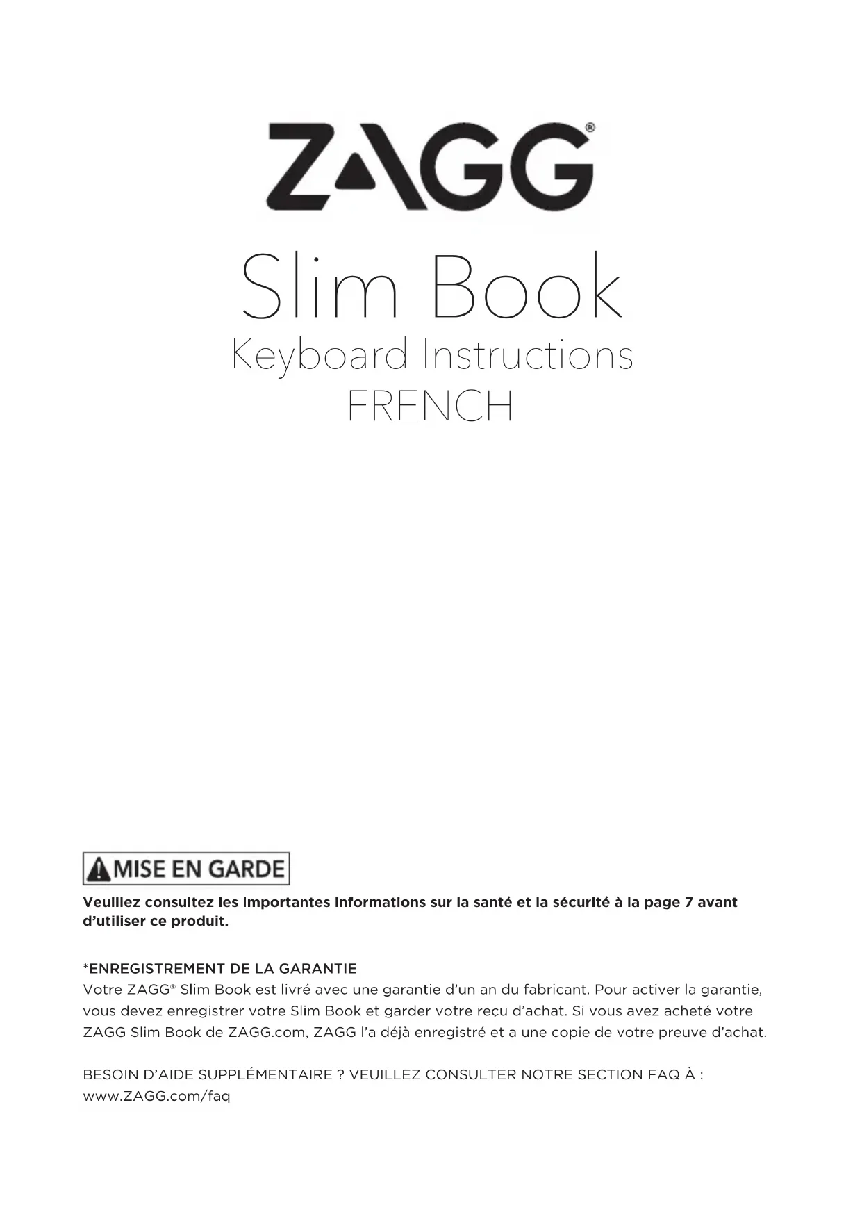Votre ZAGG® Slim Book est livré avec une garantie d’un an du fabricant. Pour activer la garantie, vous devez enregistrer votre Slim Book et garder votre reçu d’achat. Si vous avez acheté votre ZAGG Slim Book de ZAGG.com, ZAGG l’a déjà enregistré et a une copie de votre preuve d’achat. BESOIN D’AIDE SUPPLÉMENTAIRE ? VEUILLEZ CONSULTER NOTRE SECTION FAQ À : www.ZAGG.com/faq Veuillez consultez les importantes informations sur la santé et la sécurité à la page 7 avant d’utiliser ce produit.1 INSÉRER/RETIRER VOTRE iPad® Pour insérer votre iPad® dans le Slim Book, ouvrez l’étui du Slim Book et séparez-le du clavier (pour ce faire, tirez l’étui vers le haut en l’éloignant du clavier). Ensuite, alignez votre iPad sur les trous de l’étui. Assurez-vous que le trou de la caméra ainsi que l’ouverture pour le câble Lightning sont alignés correctement. Lorsque tout est aligné, insérez la moitié inférieure de votre iPad dans le couvercle et appliquez une légère pression pour bien l’insérer. Enclenchez la moitié supérieure de votre iPad dans le couvercle. Vérifiez tous les coins pour vous assurer qu’ils sont correctement positionnés. Lorsque votre iPad est sécurisé dans l’étui, vous pouvez le rattacher à votre clavier en le plaçant dans le support magnétique. Des aimants puissants le fixeront solidement en place, mais vous permettront également de le retirer quand vous le voudrez. Pour retirer facilement votre iPad, saisissez le haut du couvercle du Slim Book au milieu et appuyez légèrement sur l’arrière de votre iPad. Saisissez le côté exposé de votre iPad et tirez/soulevez pour l’extraire du Slim Book.