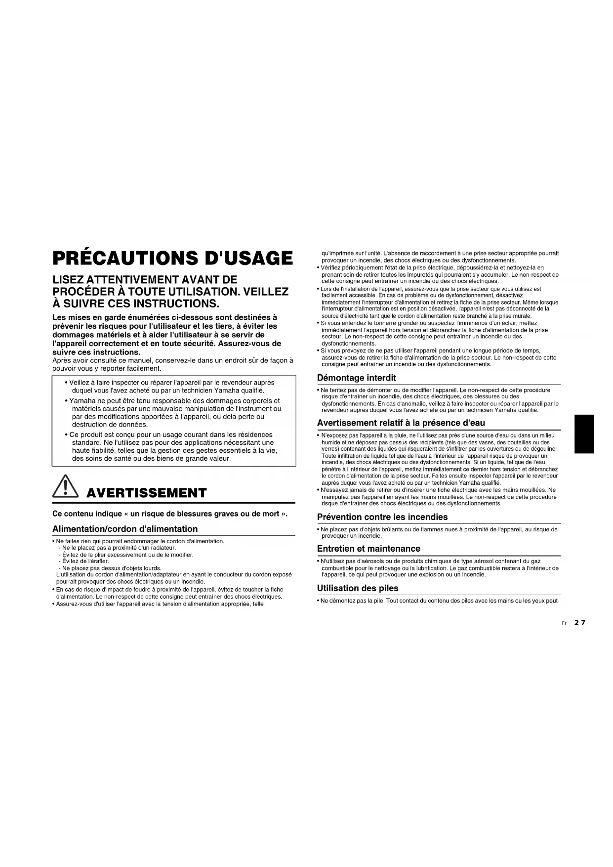 - Veillez à ne pas faire tomber l'appareil et à ne pas lui appliquer une pression excessive. Si vous suspectez que l'appareil a pu être endommagé à la suite d'une chute ou d'un impact, coupez immédiatement l'alimentation et retirez la fiche de la prise secteur. Le non-respect de cette procédure risque d'entraîner des chocs électriques, un incendie ou des dysfonctionnements. Faites immédiatement inspecter l'appareil par le revendeur auprès duquel vous l'avez acheté ou par un technicien Yamaha qualifié. ATTENTION Ce contenu indique « un risque de blessures ». Alimentation/cordon d'alimentation