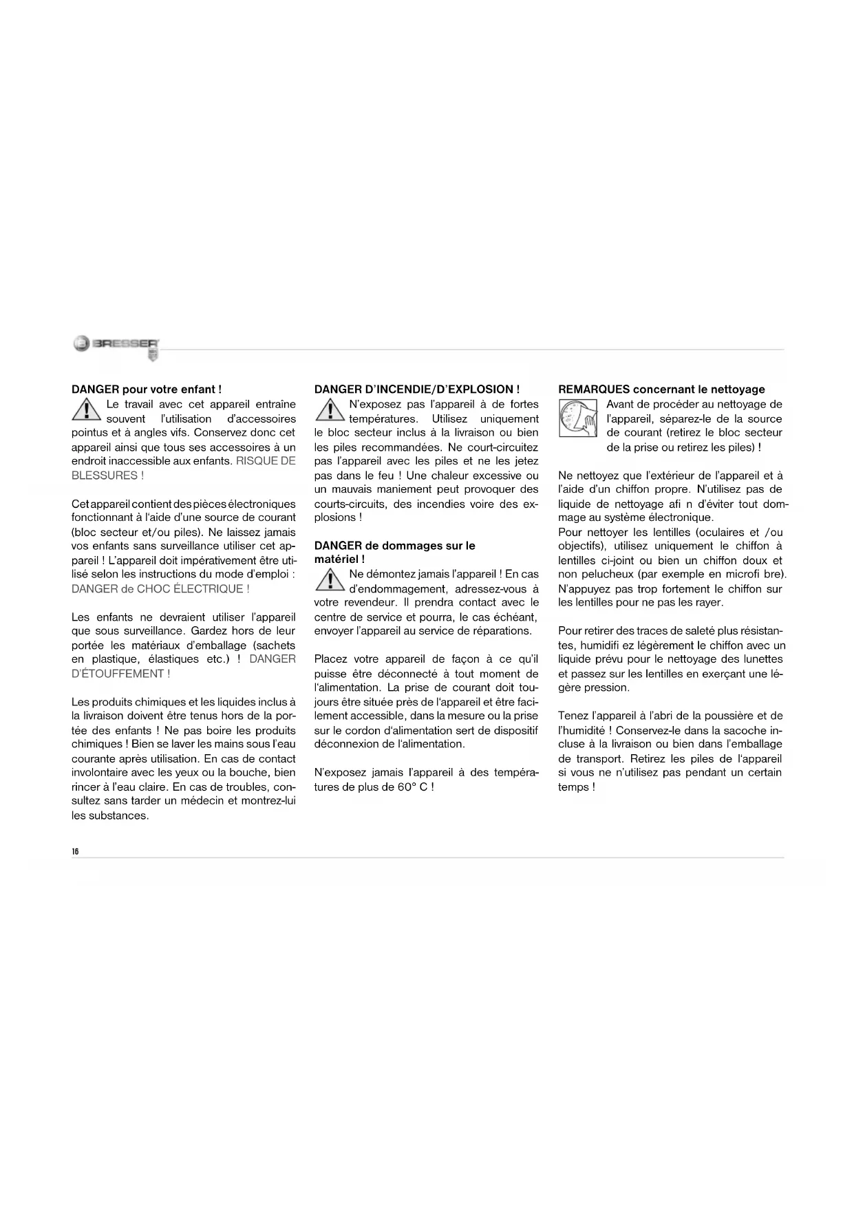 - If necessary, in- crease resolution of graphics card Make sure your microscope has a long service life. Clean the lens (objective and eyepiece) only with the cloth supplied or some other soft lint- free cloth (e.g.microfi bre). Do not press hard as this might scratch the lens. Ask your parents to help if your microscope is really very dirty. The cleaning cloth should be moistened with cleaning fl uid and the lens wiped clean using little pressure. Make sure your microscope is always protec- ted against dust and dirt. After use leave it in a warm room to dry off. Then install the dust caps and keep it in the case provided.16 DANGER pour votre enfant ! Le travail avec cet appareil entraîne souvent l’utilisation d’accessoires pointus et à angles vifs. Conservez donc cet appareil ainsi que tous ses accessoires à un endroit inaccessible aux enfants. RISQUE DE BLESSURES ! Cet appareil contient des pièces électroniques fonctionnant à l‘aide d’une source de courant (bloc secteur et/ou piles). Ne laissez jamais vos enfants sans surveillance utiliser cet ap- pareil ! L’appareil doit impérativement être uti- lisé selon les instructions du mode d’emploi : DANGER de CHOC ÉLECTRIQUE ! Les enfants ne devraient utiliser l’appareil que sous surveillance. Gardez hors de leur portée les matériaux d’emballage (sachets en plastique, élastiques etc.) ! DANGER D’ÉTOUFFEMENT ! Les produits chimiques et les liquides inclus à la livraison doivent être tenus hors de la por- tée des enfants ! Ne pas boire les produits chimiques ! Bien se laver les mains sous l’eau courante après utilisation. En cas de contact involontaire avec les yeux ou la bouche, bien rincer à l’eau claire. En cas de troubles, con- sultez sans tarder un médecin et montrez-lui les substances. DANGER D’INCENDIE/D’EXPLOSION ! N’exposez pas l’appareil à de fortes températures. Utilisez uniquement le bloc secteur inclus à la livraison ou bien les piles recommandées. Ne court-circuitez pas l’appareil avec les piles et ne les jetez pas dans le feu ! Une chaleur excessive ou un mauvais maniement peut provoquer des courts-circuits, des incendies voire des ex- plosions ! DANGER de dommages sur le matériel ! Ne démontez jamais l’appareil ! En cas d’endommagement, adressez-vous à votre revendeur. Il prendra contact avec le centre de service et pourra, le cas échéant, envoyer l’appareil au service de réparations. Placez votre appareil de façon à ce qu’il puisse être déconnecté à tout moment de l‘alimentation. La prise de courant doit tou- jours être située près de l‘appareil et être faci- lement accessible, dans la mesure ou la prise sur le cordon d‘alimentation sert de dispositif déconnexion de l‘alimentation. N’exposez jamais l’appareil à des tempéra- tures de plus de 60° C ! REMARQUES concernant le nettoyage Avant de procéder au nettoyage de l’appareil, séparez-le de la source de courant (retirez le bloc secteur de la prise ou retirez les piles) ! Ne nettoyez que l’extérieur de l’appareil et à l’aide d’un chiffon propre. N’utilisez pas de liquide de nettoyage afi n d’éviter tout dom- mage au système électronique. Pour nettoyer les lentilles (oculaires et /ou objectifs), utilisez uniquement le chiffon à lentilles ci-joint ou bien un chiffon doux et non pelucheux (par exemple en microfi bre). N’appuyez pas trop fortement le chiffon sur les lentilles pour ne pas les rayer. Pour retirer des traces de saleté plus résistan- tes, humidifi ez légèrement le chiffon avec un liquide prévu pour le nettoyage des lunettes et passez sur les lentilles en exerçant une lé- gère pression. Tenez l’appareil à l’abri de la poussière et de l’humidité ! Conservez-le dans la sacoche in- cluse à la livraison ou bien dans l’emballage de transport. Retirez les piles de l‘appareil si vous ne n’utilisez pas pendant un certain temps !17